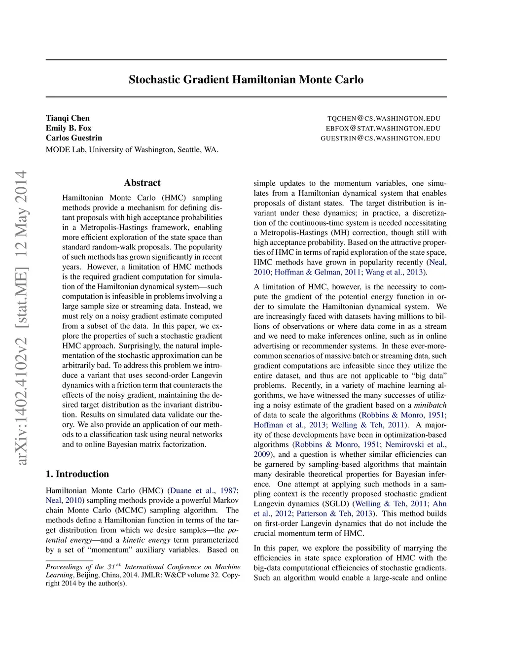 Hamiltonian Monte Carlo (HMC) sampling methods provide a mechanism for defining distant proposals with high acceptance probabilities in a Metropolis-Hastings framework, enabling more efficient exploration of the state space than standard random-walk proposals. The popularity of such methods has grown significantly in recent years. However, a limitation of HMC methods is the required gradient computation for simulation of the Hamiltonian dynamical system-such computation is infeasible in problems involving a large sample size or streaming data. Instead, we must rely on a noisy gradient estimate computed from a subset of the data. In this paper, we explore the properties of such a stochastic gradient HMC approach. Surprisingly, the natural implementation of the stochastic approximation can be arbitrarily bad. To address this problem we introduce a variant that uses second-order Langevin dynamics with a friction term that counteracts the effects of the noisy gradient, maintaining the desired target distribution as the invariant distribution. Results on simulated data validate our theory. We also provide an application of our methods to a classification task using neural networks and to online Bayesian matrix factorization.