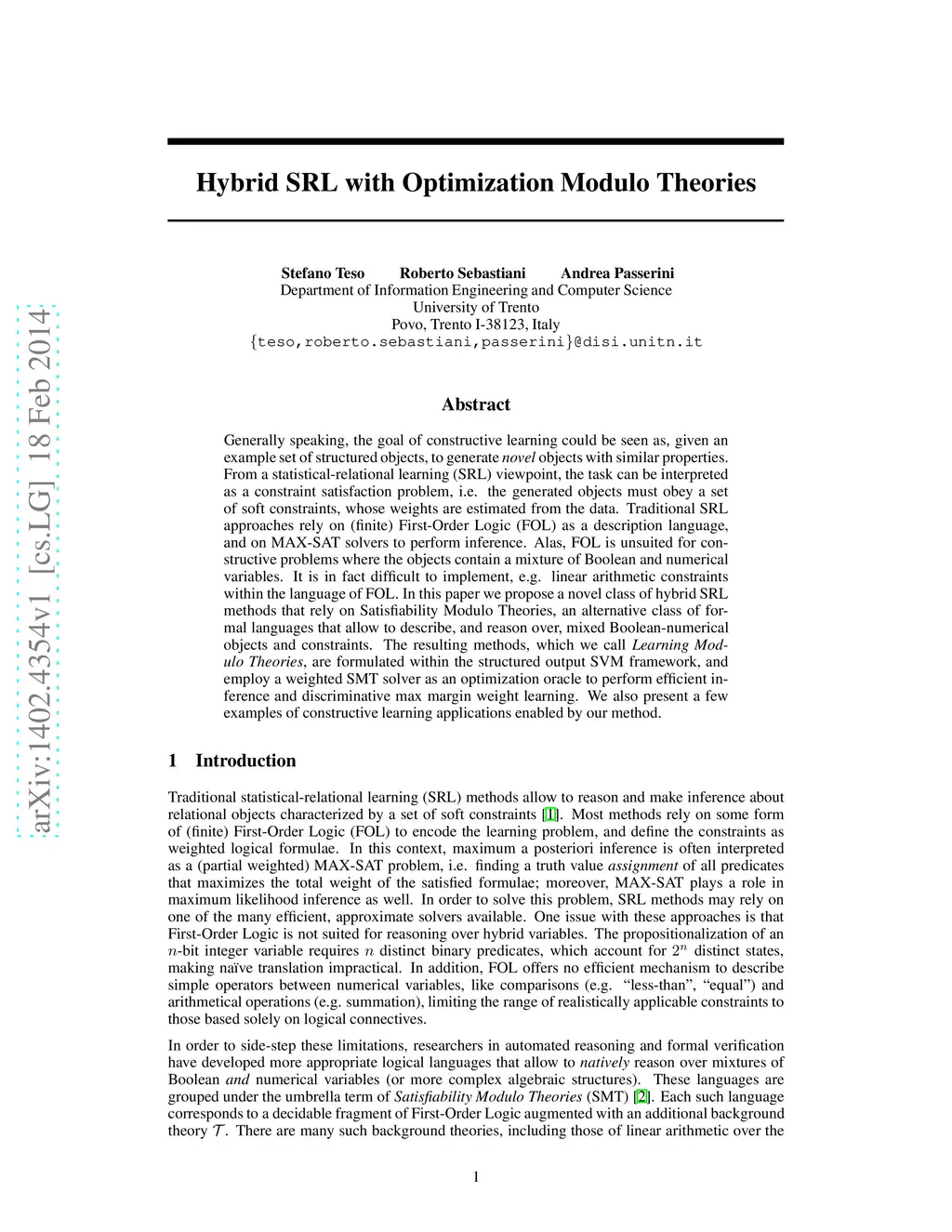 Hybrid SRL with Optimization Modulo Theories