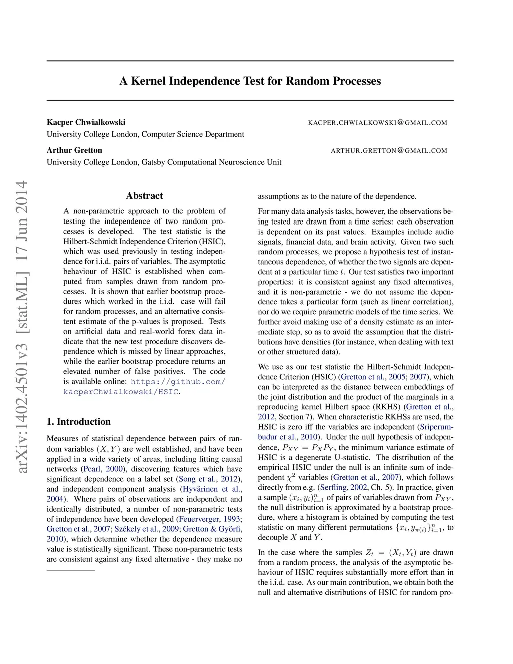 A new non parametric approach to the problem of testing the independence of two random process is developed. The test statistic is the Hilbert Schmidt Independence Criterion (HSIC), which was used previously in testing independence for i.i.d pairs of variables. The asymptotic behaviour of HSIC is established when computed from samples drawn from random processes. It is shown that earlier bootstrap procedures which worked in the i.i.d. case will fail for random processes, and an alternative consistent estimate of the p-values is proposed. Tests on artificial data and real-world Forex data indicate that the new test procedure discovers dependence which is missed by linear approaches, while the earlier bootstrap procedure returns an elevated number of false positives. The code is available online: https://github.com/kacperChwialkowski/HSIC .