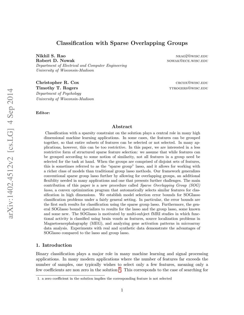 Classification with a sparsity constraint on the solution plays a central role in many high dimensional machine learning applications. In some cases, the features can be grouped together so that entire subsets of features can be selected or not selected. In many applications, however, this can be too restrictive. In this paper, we are interested in a less restrictive form of structured sparse feature selection: we assume that while features can be grouped according to some notion of similarity, not all features in a group need be selected for the task at hand. When the groups are comprised of disjoint sets of features, this is sometimes referred to as the "sparse group" lasso, and it allows for working with a richer class of models than traditional group lasso methods. Our framework generalizes conventional sparse group lasso further by allowing for overlapping groups, an additional flexiblity needed in many applications and one that presents further challenges. The main contribution of this paper is a new procedure called Sparse Overlapping Group (SOG) lasso, a convex optimization program that automatically selects similar features for classification in high dimensions. We establish model selection error bounds for SOGlasso classification problems under a fairly general setting. In particular, the error bounds are the first such results for classification using the sparse group lasso. Furthermore, the general SOGlasso bound specializes to results for the lasso and the group lasso, some known and some new. The SOGlasso is motivated by multi-subject fMRI studies in which functional activity is classified using brain voxels as features, source localization problems in Magnetoencephalography (MEG), and analyzing gene activation patterns in microarray data analysis. Experiments with real and synthetic data demonstrate the advantages of SOGlasso compared to the lasso and group lasso.