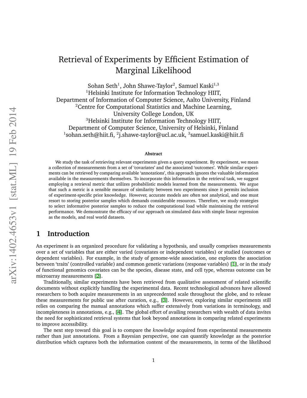 Retrieval of Experiments by Efficient Estimation of Marginal Likelihood