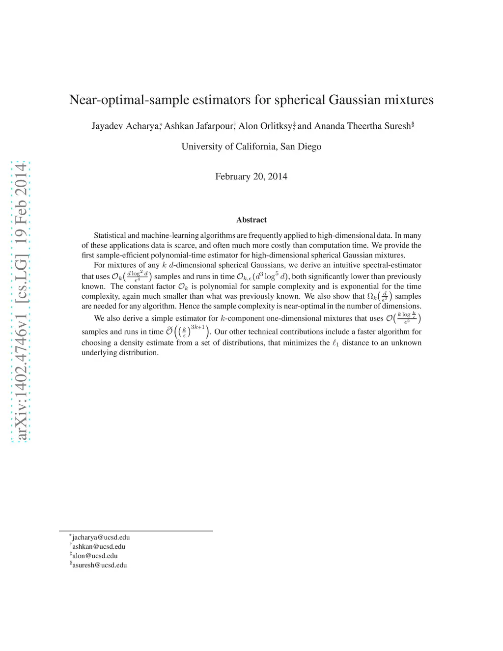 Statistical and machine-learning algorithms are frequently applied to high-dimensional data. In many of these applications data is scarce, and often much more costly than computation time. We provide the first sample-efficient polynomial-time estimator for high-dimensional spherical Gaussian mixtures. For mixtures of any -dimensional spherical Gaussians, we derive an intuitive spectral-estimator that uses samples and runs in time , both significantly lower than previously known. The constant factor is polynomial for sample complexity and is exponential for the time complexity, again much smaller than what was previously known. We also show that samples are needed for any algorithm. Hence the sample complexity is near-optimal in the number of dimensions. We also derive a simple estimator for one-dimensional mixtures that uses samples and runs in time . Our other technical contributions include a faster algorithm for choosing a density estimate from a set of distributions, that minimizes the distance to an unknown underlying distribution.