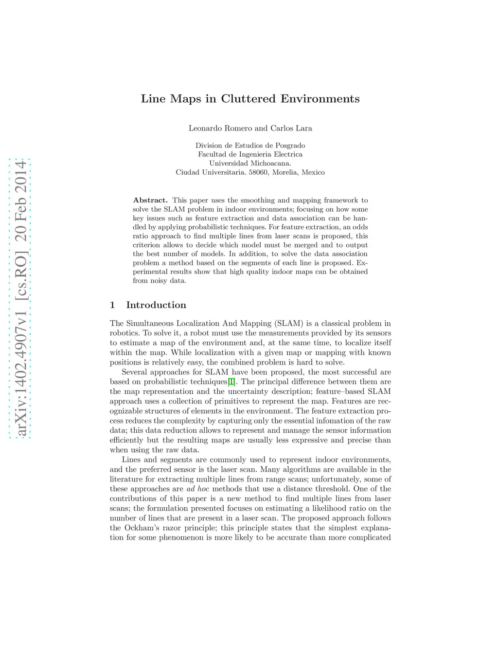 This paper uses the smoothing and mapping framework to solve the SLAM problem in indoor environments; focusing on how some key issues such as feature extraction and data association can be handled by applying probabilistic techniques. For feature extraction, an odds ratio approach to find multiple lines from laser scans is proposed, this criterion allows to decide which model must be merged and to output the best number of models. In addition, to solve the data association problem a method based on the segments of each line is proposed. Experimental results show that high quality indoor maps can be obtained from noisy data