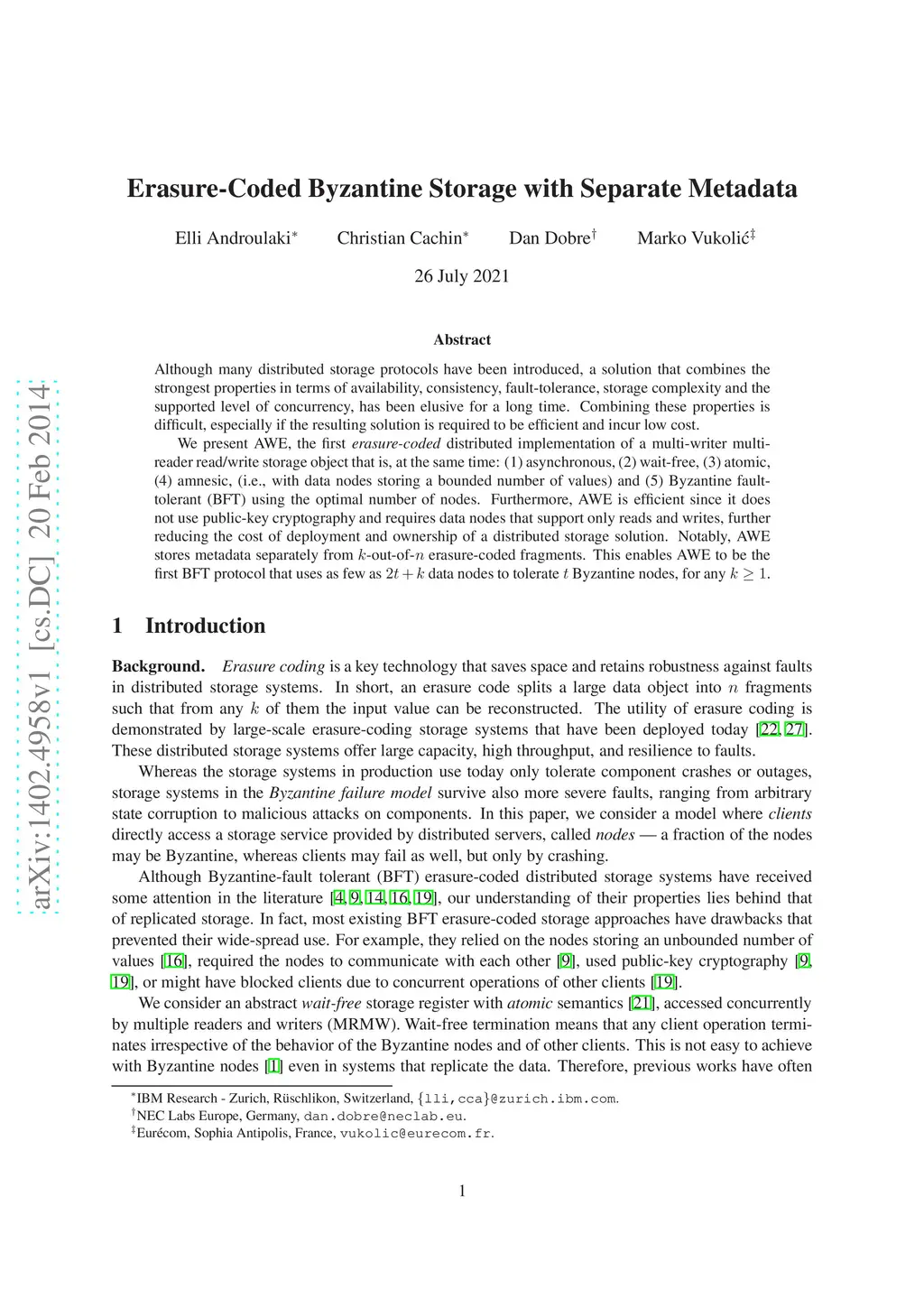 Although many distributed storage protocols have been introduced, a solution that combines the strongest properties in terms of availability, consistency, fault-tolerance, storage complexity and the supported level of concurrency, has been elusive for a long time. Combining these properties is difficult, especially if the resulting solution is required to be efficient and incur low cost. We present AWE, the first erasure-coded distributed implementation of a multi-writer multi-reader read/write storage object that is, at the same time: (1) asynchronous, (2) wait-free, (3) atomic, (4) amnesic, (i.e., with data nodes storing a bounded number of values) and (5) Byzantine fault-tolerant (BFT) using the optimal number of nodes. Furthermore, AWE is efficient since it does not use public-key cryptography and requires data nodes that support only reads and writes, further reducing the cost of deployment and ownership of a distributed storage solution. Notably, AWE stores metadata separately from -out-of- erasure-coded fragments. This enables AWE to be the first BFT protocol that uses as few as data nodes to tolerate Byzantine nodes, for any .
