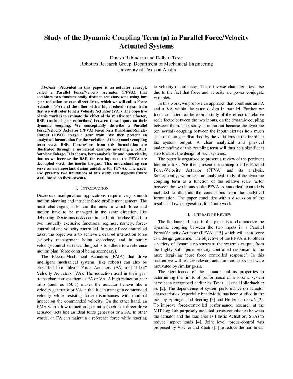 Presented in this paper is an actuator concept, called a Parallel Force/Velocity Actuator (PFVA), that combines two fundamentally distinct actuators (one using low gear reduction or even direct drive, which we will call a Force Actuator (FA) and the other with a high reduction gear train that we will refer to as a Velocity Actuator (VA)). The objective of this work is to evaluate the effect of the relative scale factor, RSF, (ratio of gear reductions) between these inputs on their dynamic coupling. We conceptually describe a Parallel Force/Velocity Actuator (PFVA) based on a Dual-Input-Single- Output (DISO) epicyclic gear train. We then present an analytical formulation for the variation of the dynamic coupling term w.r.t. RSF. Conclusions from this formulation are illustrated through a numerical example involving a 1-DOF four-bar linkage. It is shown, both analytically and numerically, that as we increase the RSF, the two inputs to the PFVA are decoupled w.r.t. the inertia torques. This understanding can serve as an important design guideline for PFVAs. The paper also presents two limitations of this study and suggests future work based on these caveats.