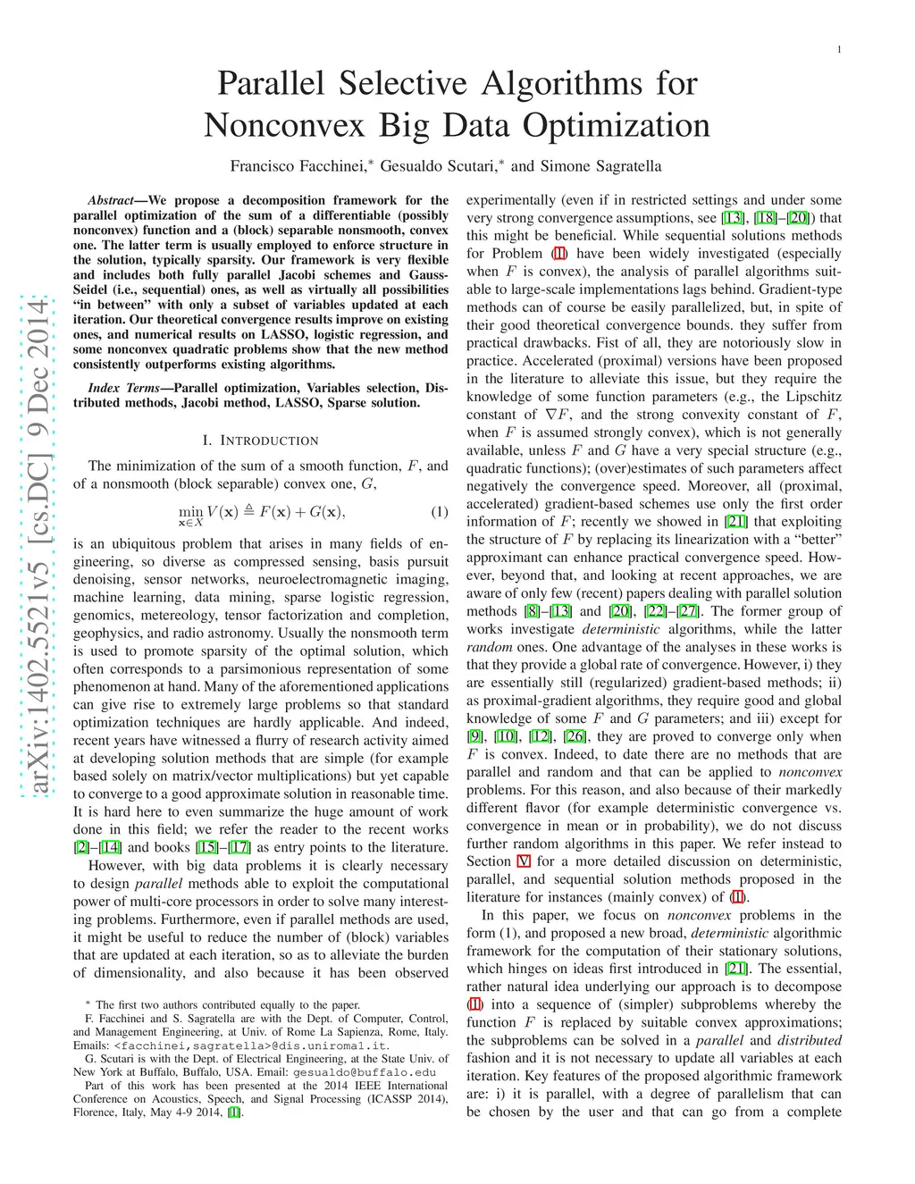 We propose a decomposition framework for the parallel optimization of the sum of a differentiable (possibly nonconvex) function and a (block) separable nonsmooth, convex one. The latter term is usually employed to enforce structure in the solution, typically sparsity. Our framework is very flexible and includes both fully parallel Jacobi schemes and Gauss- Seidel (i.e., sequential) ones, as well as virtually all possibilities "in between" with only a subset of variables updated at each iteration. Our theoretical convergence results improve on existing ones, and numerical results on LASSO, logistic regression, and some nonconvex quadratic problems show that the new method consistently outperforms existing algorithms.