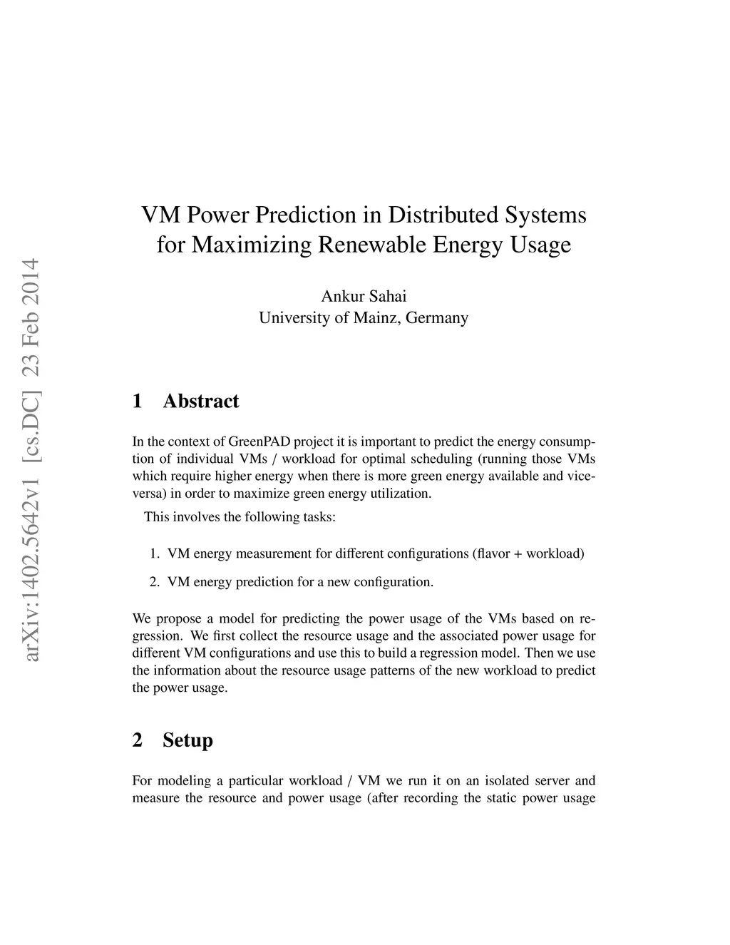 In the context of GreenPAD project it is important to predict the energy consumption of individual (and mixture of) VMs / workload for optimal scheduling (running those VMs which require higher energy when there is more green energy available and vice-versa) in order to maximize green energy utilization. For this we execute the following experiments on an Openstack cloud testbed consisting of Fujitsu servers: VM energy measurement for different configurations (flavor + workload) and VM energy prediction for a new configuration. The automation framework for running these experiments uses bash scripts which call tools like 'stress' (simulating workloads), 'collected' (resource usage) and ÍPMI' (power measurement). We propose a linear model for predicting the power usage of the VMs based on regression. We first collect the resource usage (using collected) and the associated power usage (using IPMI) for different VM configurations and use this to build a (multi-) regression model (between resource usage and VM energy consumption). Then we use the information about the resource usage patterns of the new workload to predict the power usage. For predicting power for mix of workloads we execute (build a regression model based on) experiments with random workloads. We observe the highest energy usage for CPU-intensive workloads followed by memory-intensive workloads.
