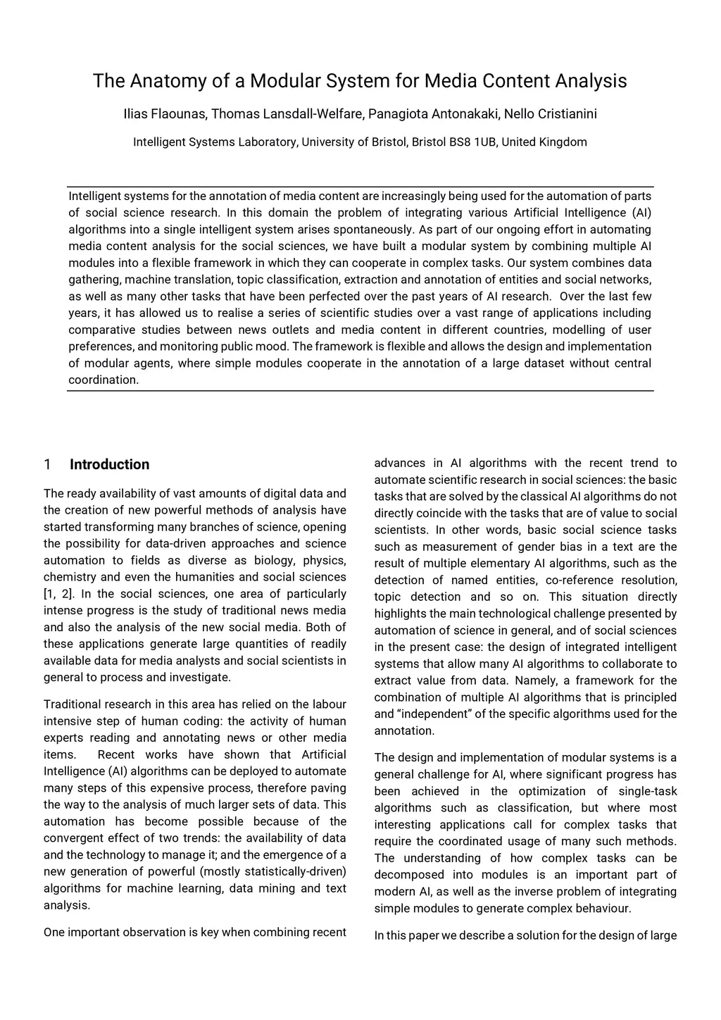 Intelligent systems for the annotation of media content are increasingly being used for the automation of parts of social science research. In this domain the problem of integrating various Artificial Intelligence (AI) algorithms into a single intelligent system arises spontaneously. As part of our ongoing effort in automating media content analysis for the social sciences, we have built a modular system by combining multiple AI modules into a flexible framework in which they can cooperate in complex tasks. Our system combines data gathering, machine translation, topic classification, extraction and annotation of entities and social networks, as well as many other tasks that have been perfected over the past years of AI research. Over the last few years, it has allowed us to realise a series of scientific studies over a vast range of applications including comparative studies between news outlets and media content in different countries, modelling of user preferences, and monitoring public mood. The framework is flexible and allows the design and implementation of modular agents, where simple modules cooperate in the annotation of a large dataset without central coordination.