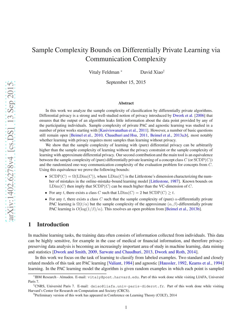 In this work we analyze the sample complexity of classification by differentially private algorithms. Differential privacy is a strong and well-studied notion of privacy introduced by Dwork et al. (2006) that ensures that the output of an algorithm leaks little information about the data point provided by any of the participating individuals. Sample complexity of private PAC and agnostic learning was studied in a number of prior works starting with (Kasiviswanathan et al., 2008) but a number of basic questions still remain open, most notably whether learning with privacy requires more samples than learning without privacy. We show that the sample complexity of learning with (pure) differential privacy can be arbitrarily higher than the sample complexity of learning without the privacy constraint or the sample complexity of learning with approximate differential privacy. Our second contribution and the main tool is an equivalence between the sample complexity of (pure) differentially private learning of a concept class (or ) and the randomized one-way communication complexity of the evaluation problem for concepts from . Using this equivalence we prove the following bounds: 1. , where is the Littlestone's (1987) dimension characterizing the number of mistakes in the online-mistake-bound learning model. Known bounds on then imply that can be much higher than the VC-dimension of . 2. For any , there exists a class such that but . 3. For any , there exists a class such that the sample complexity of (pure) -differentially private PAC learning is but the sample complexity of the relaxed -differentially private PAC learning is . This resolves an open problem of Beimel et al. (2013b).