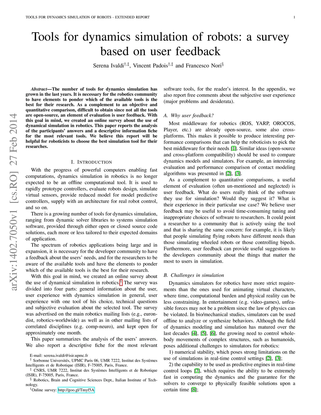 Tools for dynamics simulation of robots: a survey based on user feedback