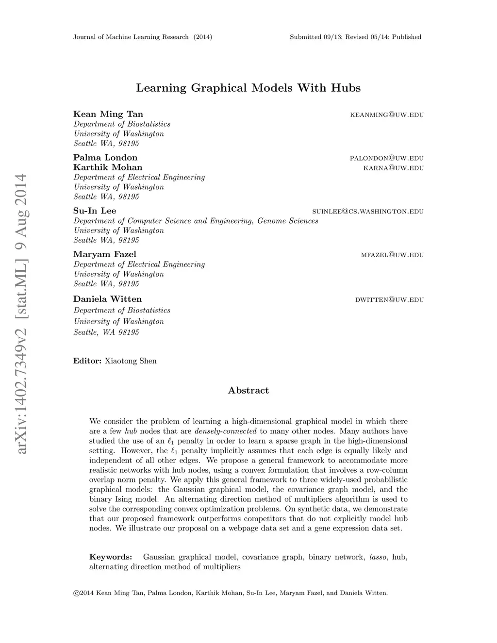 We consider the problem of learning a high-dimensional graphical model in which certain hub nodes are highly-connected to many other nodes. Many authors have studied the use of an l1 penalty in order to learn a sparse graph in high-dimensional setting. However, the l1 penalty implicitly assumes that each edge is equally likely and independent of all other edges. We propose a general framework to accommodate more realistic networks with hub nodes, using a convex formulation that involves a row-column overlap norm penalty. We apply this general framework to three widely-used probabilistic graphical models: the Gaussian graphical model, the covariance graph model, and the binary Ising model. An alternating direction method of multipliers algorithm is used to solve the corresponding convex optimization problems. On synthetic data, we demonstrate that our proposed framework outperforms competitors that do not explicitly model hub nodes. We illustrate our proposal on a webpage data set and a gene expression data set.