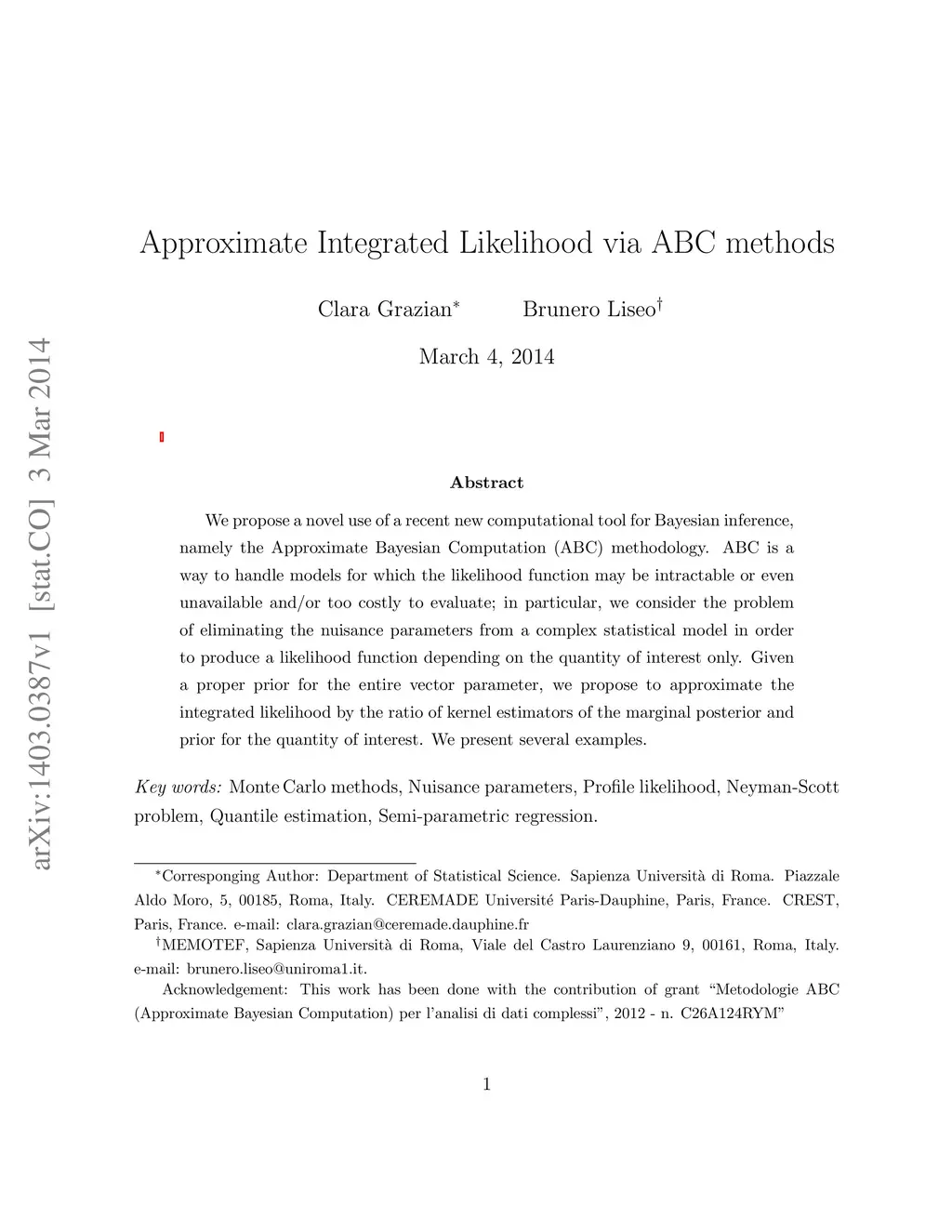 We propose a novel use of a recent new computational tool for Bayesian inference, namely the Approximate Bayesian Computation (ABC) methodology. ABC is a way to handle models for which the likelihood function may be intractable or even unavailable and/or too costly to evaluate; in particular, we consider the problem of eliminating the nuisance parameters from a complex statistical model in order to produce a likelihood function depending on the quantity of interest only. Given a proper prior for the entire vector parameter, we propose to approximate the integrated likelihood by the ratio of kernel estimators of the marginal posterior and prior for the quantity of interest. We present several examples.
