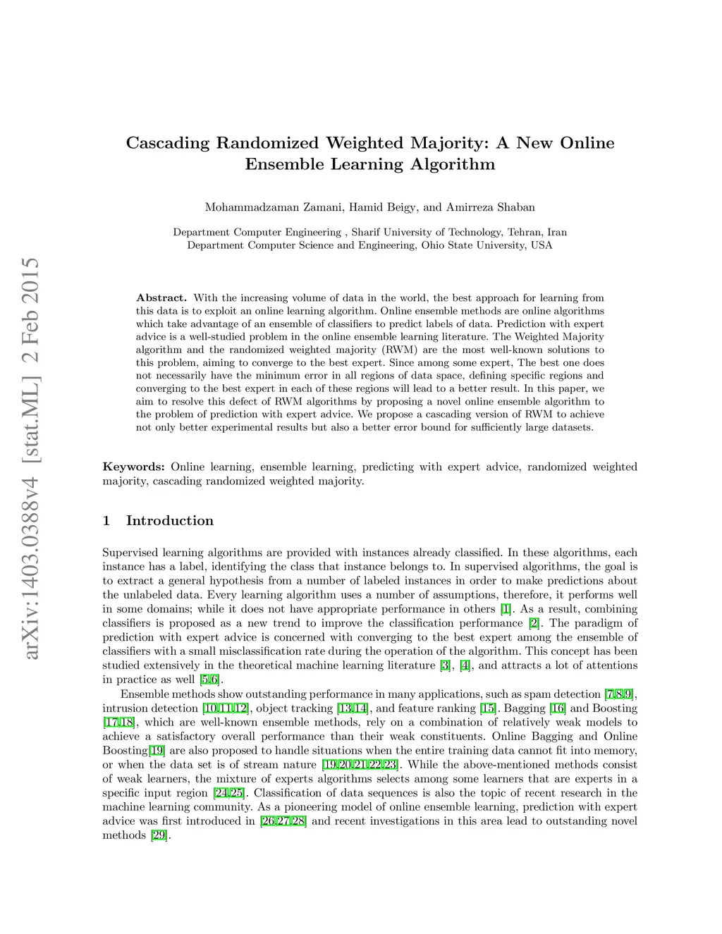 Cascading Randomized Weighted Majority: A New Online Ensemble Learning