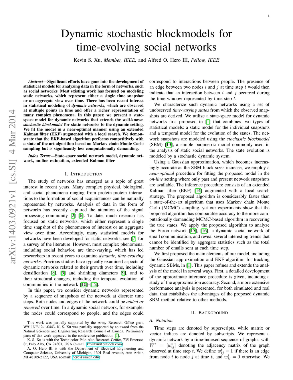 Significant efforts have gone into the development of statistical models for analyzing data in the form of networks, such as social networks. Most existing work has focused on modeling static networks, which represent either a single time snapshot or an aggregate view over time. There has been recent interest in statistical modeling of dynamic networks, which are observed at multiple points in time and offer a richer representation of many complex phenomena. In this paper, we present a state-space model for dynamic networks that extends the well-known stochastic blockmodel for static networks to the dynamic setting. We fit the model in a near-optimal manner using an extended Kalman filter (EKF) augmented with a local search. We demonstrate that the EKF-based algorithm performs competitively with a state-of-the-art algorithm based on Markov chain Monte Carlo sampling but is significantly less computationally demanding.