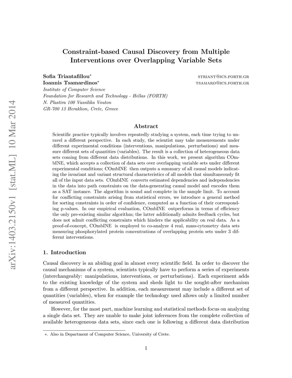 Scientific practice typically involves repeatedly studying a system, each time trying to unravel a different perspective. In each study, the scientist may take measurements under different experimental conditions (interventions, manipulations, perturbations) and measure different sets of quantities (variables). The result is a collection of heterogeneous data sets coming from different data distributions. In this work, we present algorithm COmbINE, which accepts a collection of data sets over overlapping variable sets under different experimental conditions; COmbINE then outputs a summary of all causal models indicating the invariant and variant structural characteristics of all models that simultaneously fit all of the input data sets. COmbINE converts estimated dependencies and independencies in the data into path constraints on the data-generating causal model and encodes them as a SAT instance. The algorithm is sound and complete in the sample limit. To account for conflicting constraints arising from statistical errors, we introduce a general method for sorting constraints in order of confidence, computed as a function of their corresponding p-values. In our empirical evaluation, COmbINE outperforms in terms of efficiency the only pre-existing similar algorithm; the latter additionally admits feedback cycles, but does not admit conflicting constraints which hinders the applicability on real data. As a proof-of-concept, COmbINE is employed to co-analyze 4 real, mass-cytometry data sets measuring phosphorylated protein concentrations of overlapping protein sets under 3 different interventions.
