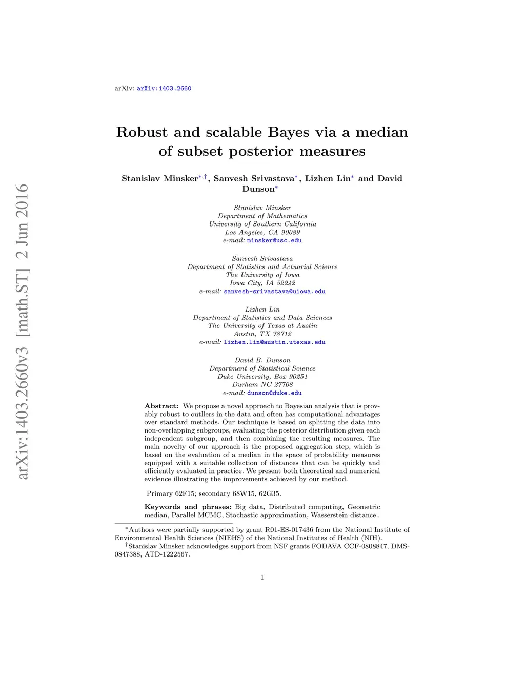 Robust and Scalable Bayes via a Median of Subset Posterior Measures