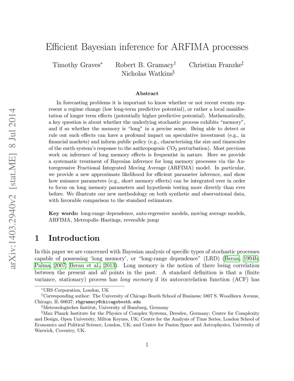 In forecasting problems it is important to know whether or not recent events represent a regime change (low long-term predictive potential), or rather a local manifestation of longer term effects (potentially higher predictive potential). Mathematically, a key question is about whether the underlying stochastic process exhibits "memory", and if so whether the memory is "long" in a precise sense. Being able to detect or rule out such effects can have a profound impact on speculative investment (e.g., in financial markets) and inform public policy (e.g., characterising the size and timescales of the earth system's response to the anthropogenic CO2 perturbation). Most previous work on inference of long memory effects is frequentist in nature. Here we provide a systematic treatment of Bayesian inference for long memory processes via the Autoregressive Fractional Integrated Moving Average (ARFIMA) model. In particular, we provide a new approximate likelihood for efficient parameter inference, and show how nuisance parameters (e.g., short memory effects) can be integrated over in order to focus on long memory parameters and hypothesis testing more directly than ever before. We illustrate our new methodology on both synthetic and observational data, with favorable comparison to the standard estimators.