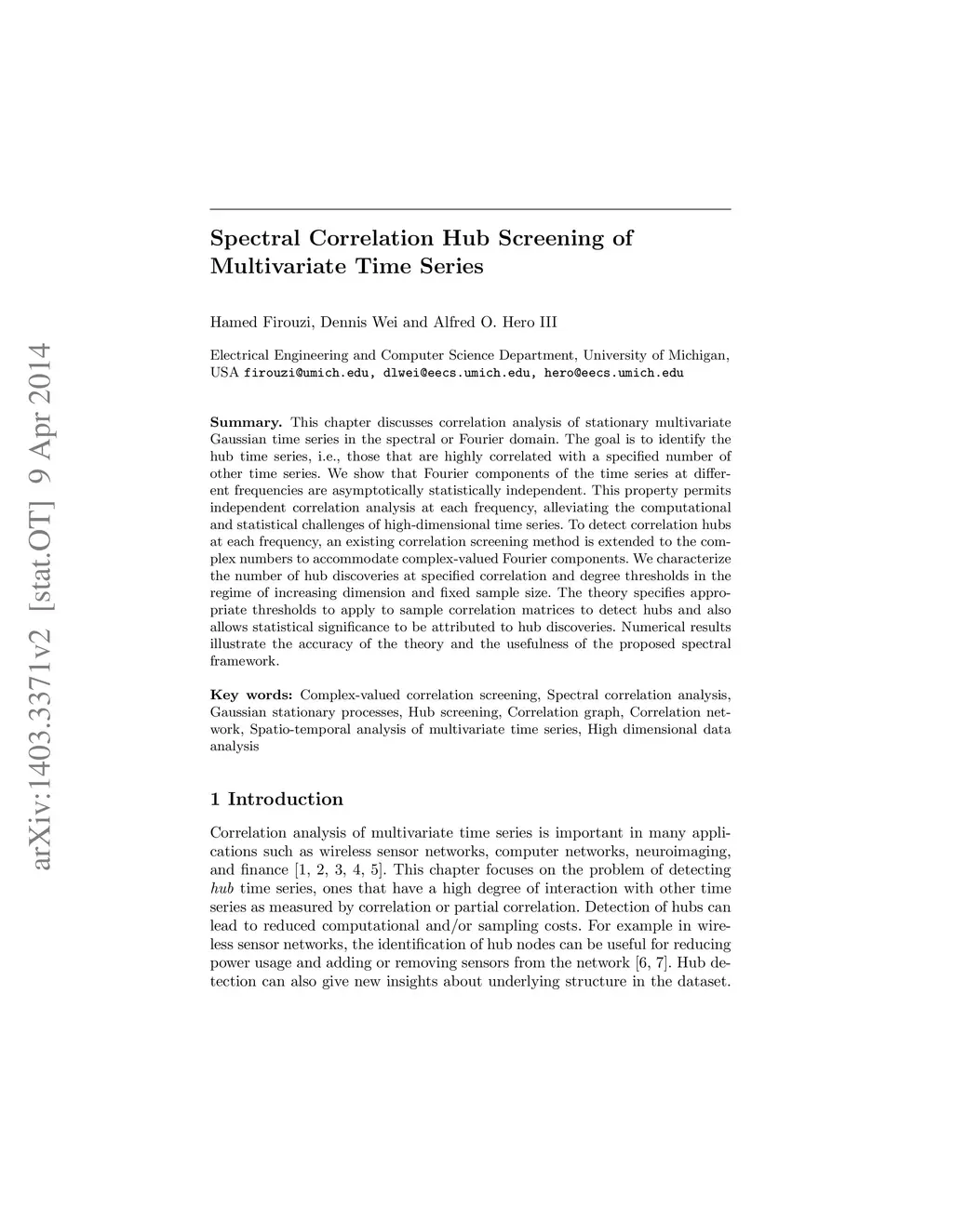 This chapter discusses correlation analysis of stationary multivariate Gaussian time series in the spectral or Fourier domain. The goal is to identify the hub time series, i.e., those that are highly correlated with a specified number of other time series. We show that Fourier components of the time series at different frequencies are asymptotically statistically independent. This property permits independent correlation analysis at each frequency, alleviating the computational and statistical challenges of high-dimensional time series. To detect correlation hubs at each frequency, an existing correlation screening method is extended to the complex numbers to accommodate complex-valued Fourier components. We characterize the number of hub discoveries at specified correlation and degree thresholds in the regime of increasing dimension and fixed sample size. The theory specifies appropriate thresholds to apply to sample correlation matrices to detect hubs and also allows statistical significance to be attributed to hub discoveries. Numerical results illustrate the accuracy of the theory and the usefulness of the proposed spectral framework.