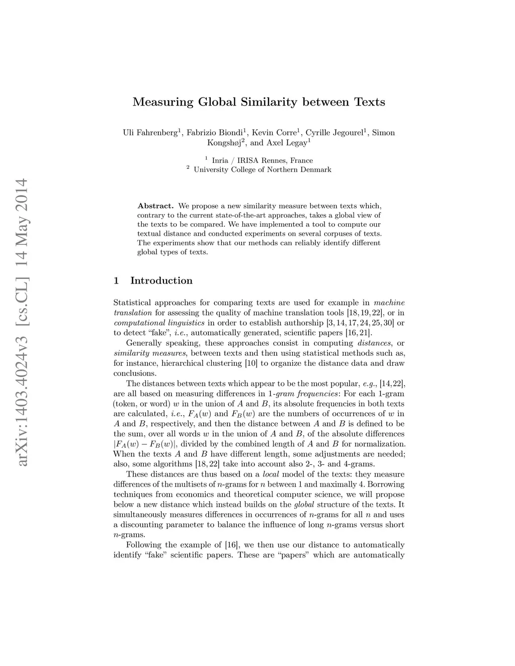We propose a new similarity measure between texts which, contrary to the current state-of-the-art approaches, takes a global view of the texts to be compared. We have implemented a tool to compute our textual distance and conducted experiments on several corpuses of texts. The experiments show that our methods can reliably identify different global types of texts.