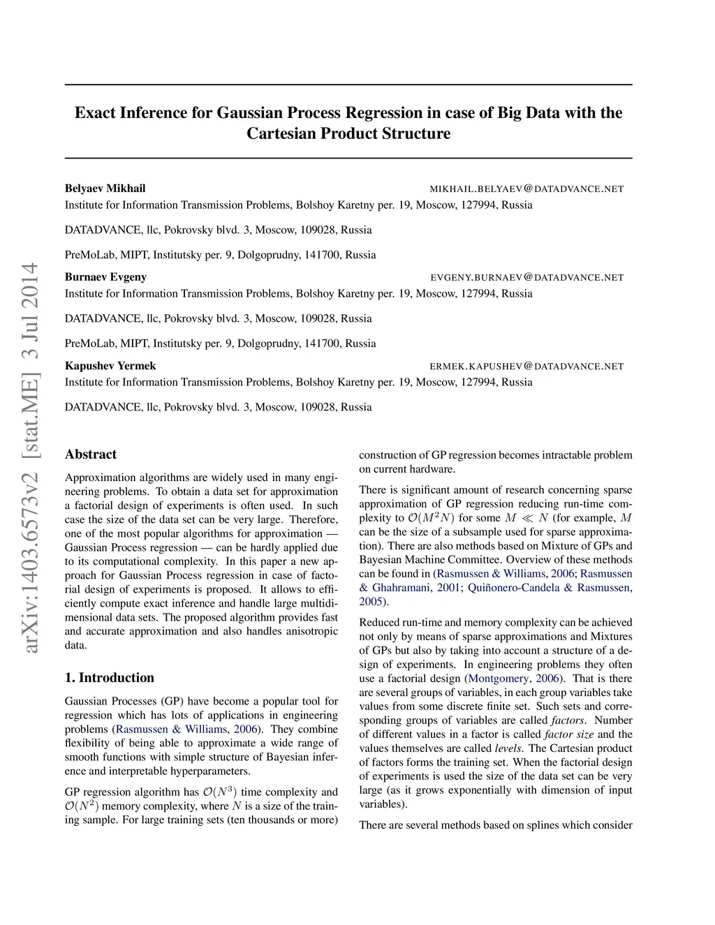 Approximation algorithms are widely used in many engineering problems. To obtain a data set for approximation a factorial design of experiments is often used. In such case the size of the data set can be very large. Therefore, one of the most popular algorithms for approximation - Gaussian Process regression - can be hardly applied due to its computational complexity. In this paper a new approach for Gaussian Process regression in case of factorial design of experiments is proposed. It allows to efficiently compute exact inference and handle large multidimensional data sets. The proposed algorithm provides fast and accurate approximation and also handles anisotropic data.
