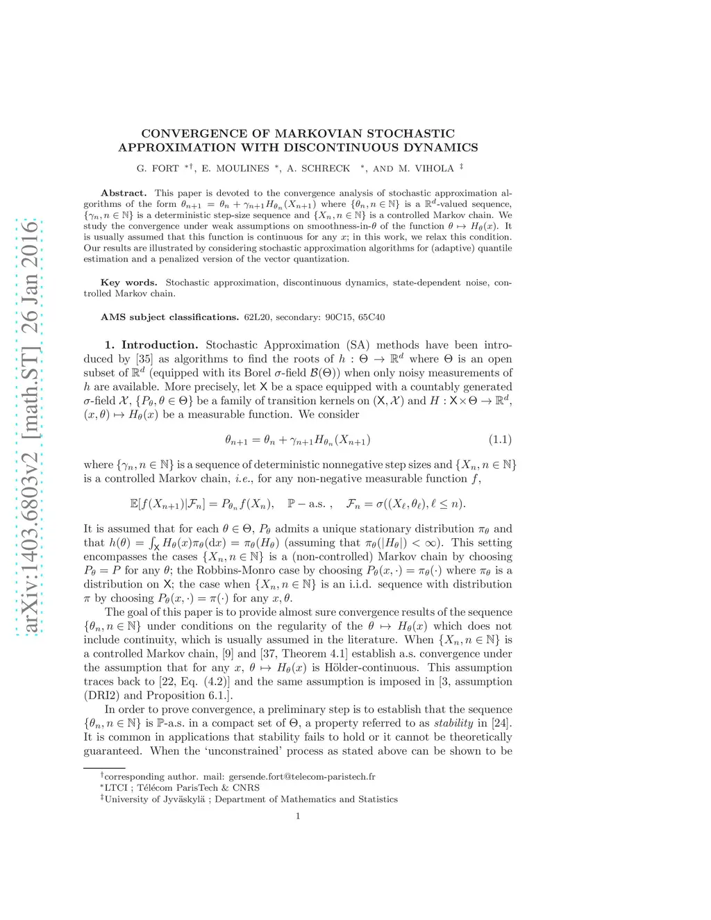 This paper is devoted to the convergence analysis of stochastic approximation algorithms of the form where is a -valued sequence, is a deterministic step-size sequence and is a controlled Markov chain. We study the convergence under weak assumptions on smoothness-in- of the function . It is usually assumed that this function is continuous for any ; in this work, we relax this condition. Our results are illustrated by considering stochastic approximation algorithms for (adaptive) quantile estimation and a penalized version of the vector quantization.