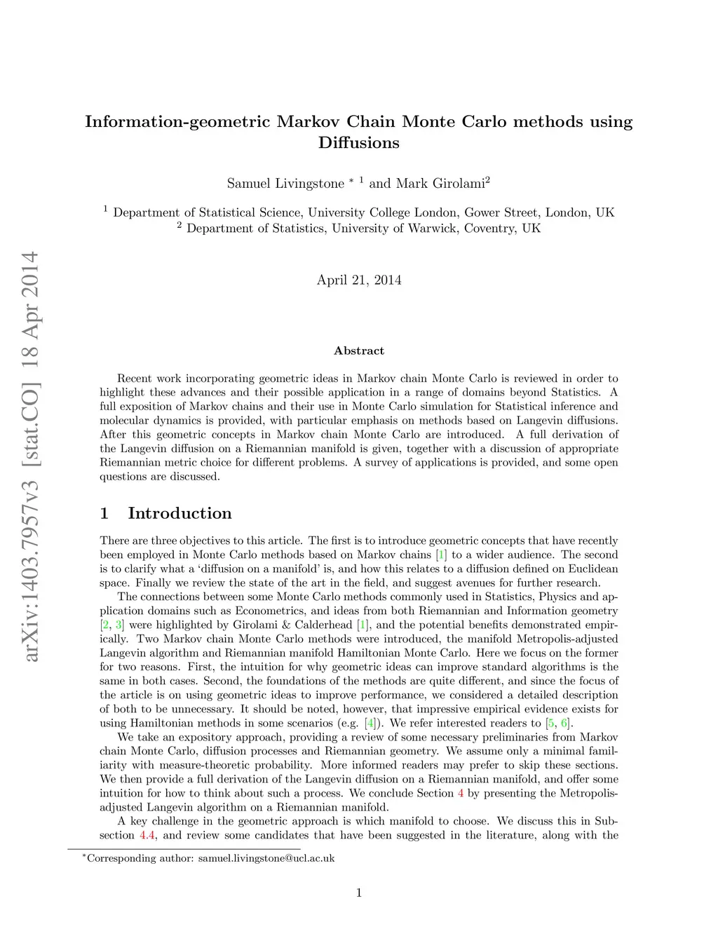 Recent work incorporating geometric ideas in Markov chain Monte Carlo is reviewed in order to highlight these advances and their possible application in a range of domains beyond Statistics. A full exposition of Markov chains and their use in Monte Carlo simulation for Statistical inference and molecular dynamics is provided, with particular emphasis on methods based on Langevin diffusions. After this geometric concepts in Markov chain Monte Carlo are introduced. A full derivation of the Langevin diffusion on a Riemannian manifold is given, together with a discussion of appropriate Riemannian metric choice for different problems. A survey of applications is provided, and some open questions are discussed.