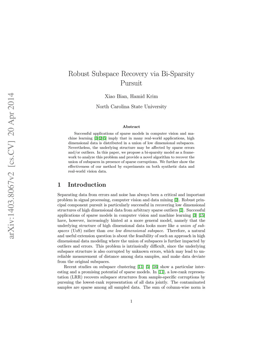 Successful applications of sparse models in computer vision and machine learning imply that in many real-world applications, high dimensional data is distributed in a union of low dimensional subspaces. Nevertheless, the underlying structure may be affected by sparse errors and/or outliers. In this paper, we propose a bi-sparse model as a framework to analyze this problem and provide a novel algorithm to recover the union of subspaces in presence of sparse corruptions. We further show the effectiveness of our method by experiments on both synthetic data and real-world vision data.