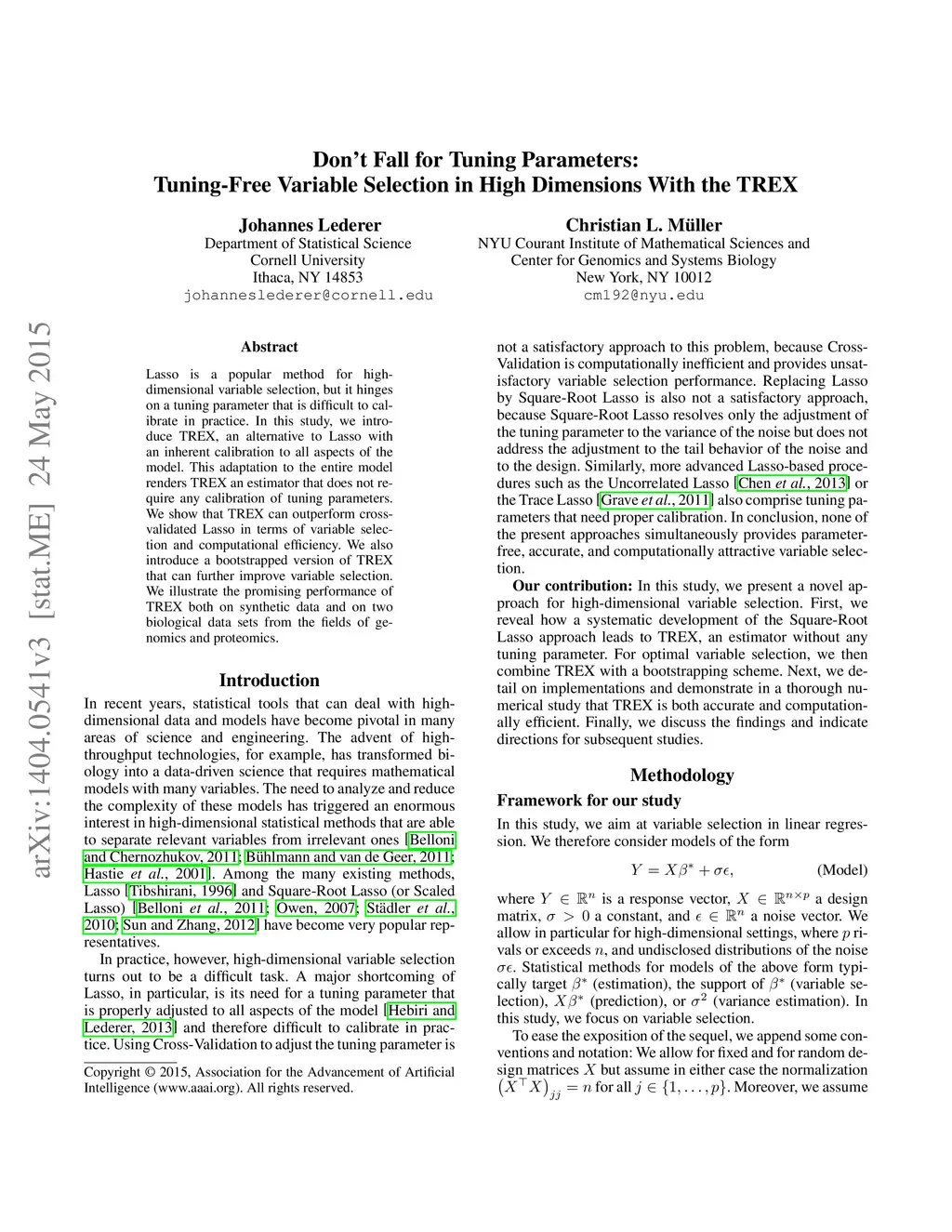 Lasso is a seminal contribution to high-dimensional statistics, but it hinges on a tuning parameter that is difficult to calibrate in practice. A partial remedy for this problem is Square-Root Lasso, because it inherently calibrates to the noise variance. However, Square-Root Lasso still requires the calibration of a tuning parameter to all other aspects of the model. In this study, we introduce TREX, an alternative to Lasso with an inherent calibration to all aspects of the model. This adaptation to the entire model renders TREX an estimator that does not require any calibration of tuning parameters. We show that TREX can outperform cross-validated Lasso in terms of variable selection and computational efficiency. We also introduce a bootstrapped version of TREX that can further improve variable selection. We illustrate the promising performance of TREX both on synthetic data and on a recent high-dimensional biological data set that considers riboflavin production in B. subtilis.