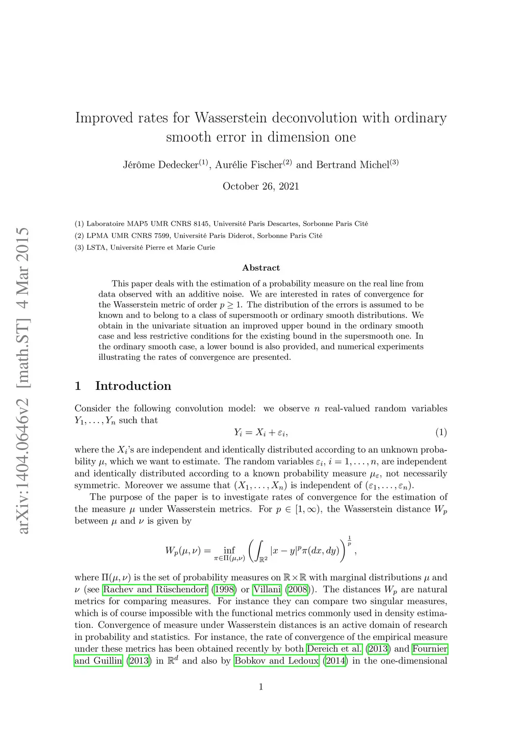 This paper deals with the estimation of a probability measure on the real line from data observed with an additive noise. We are interested in rates of convergence for the Wasserstein metric of order . The distribution of the errors is assumed to be known and to belong to a class of supersmooth or ordinary smooth distributions. We obtain in the univariate situation an improved upper bound in the ordinary smooth case and less restrictive conditions for the existing bound in the supersmooth one. In the ordinary smooth case, a lower bound is also provided, and numerical experiments illustrating the rates of convergence are presented.