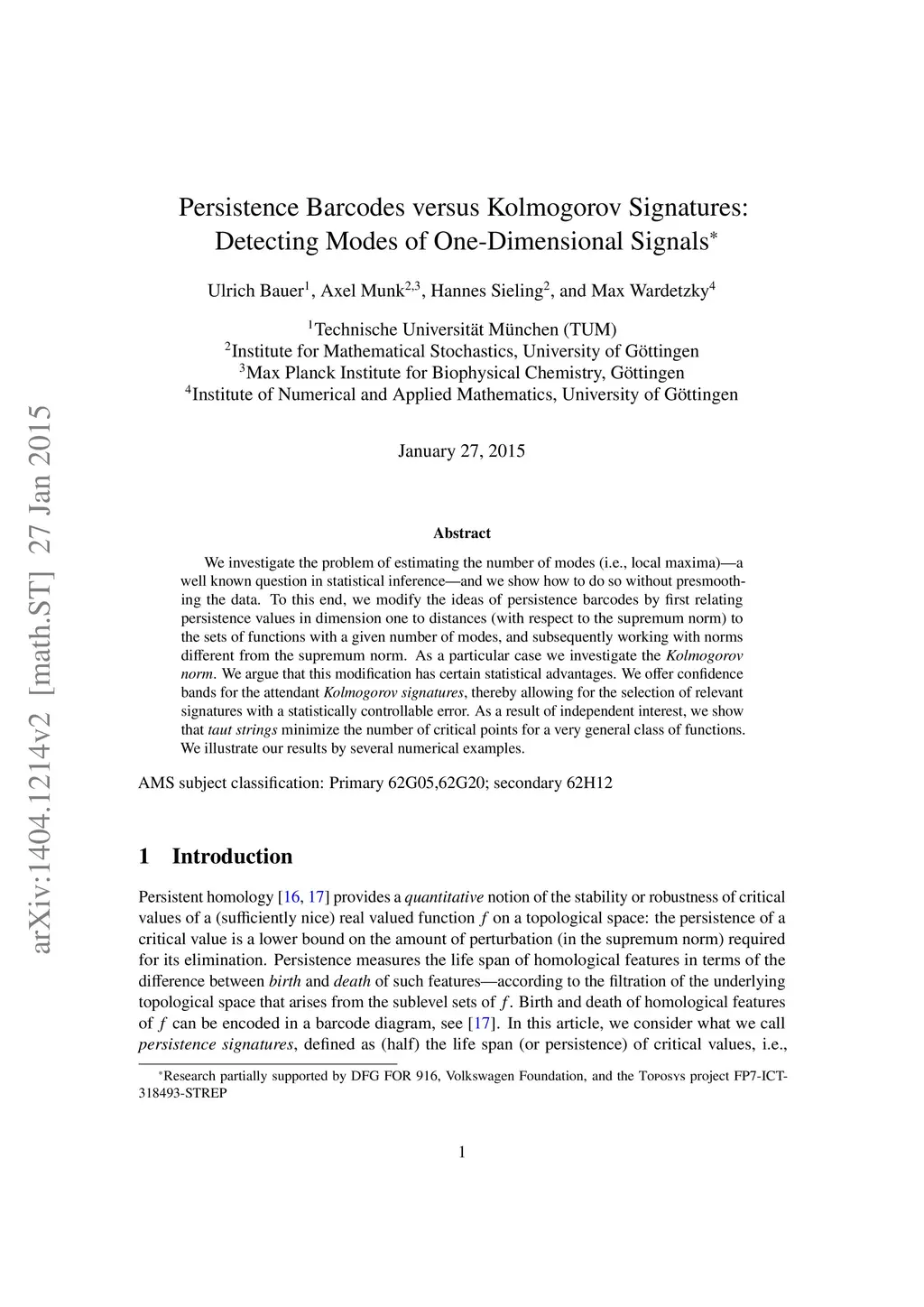 We investigate the problem of estimating the number of modes (i.e., local maxima) - a well known question in statistical inference - and we show how to do so without presmoothing the data. To this end, we modify the ideas of persistence barcodes by first relating persistence values in dimension one to distances (with respect to the supremum norm) to the sets of functions with a given number of modes, and subsequently working with norms different from the supremum norm. As a particular case we investigate the Kolmogorov norm. We argue that this modification has certain statistical advantages. We offer confidence bands for the attendant Kolmogorov signatures, thereby allowing for the selection of relevant signatures with a statistically controllable error. As a result of independent interest, we show that taut strings minimize the number of critical points for a very general class of functions. We illustrate our results by several numerical examples.