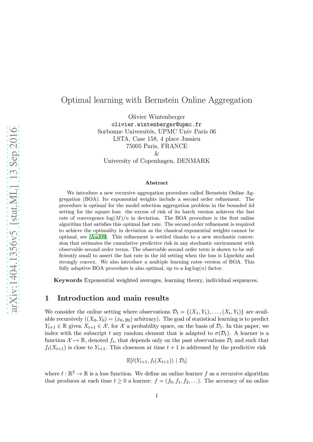 We introduce a new recursive aggregation procedure called Bernstein Online Aggregation (BOA). The exponential weights include an accuracy term and a second order term that is a proxy of the quadratic variation as in Hazan and Kale (2010). This second term stabilizes the procedure that is optimal in different senses. We first obtain optimal regret bounds in the deterministic context. Then, an adaptive version is the first exponential weights algorithm that exhibits a second order bound with excess losses that appears first in Gaillard et al. (2014). The second order bounds in the deterministic context are extended to a general stochastic context using the cumulative predictive risk. Such conversion provides the main result of the paper, an inequality of a novel type comparing the procedure with any deterministic aggregation procedure for an integrated criteria. Then we obtain an observable estimate of the excess of risk of the BOA procedure. To assert the optimality, we consider finally the iid case for strongly convex and Lipschitz continuous losses and we prove that the optimal rate of aggregation of Tsybakov (2003) is achieved. The batch version of the BOA procedure is then the first adaptive explicit algorithm that satisfies an optimal oracle inequality with high probability.