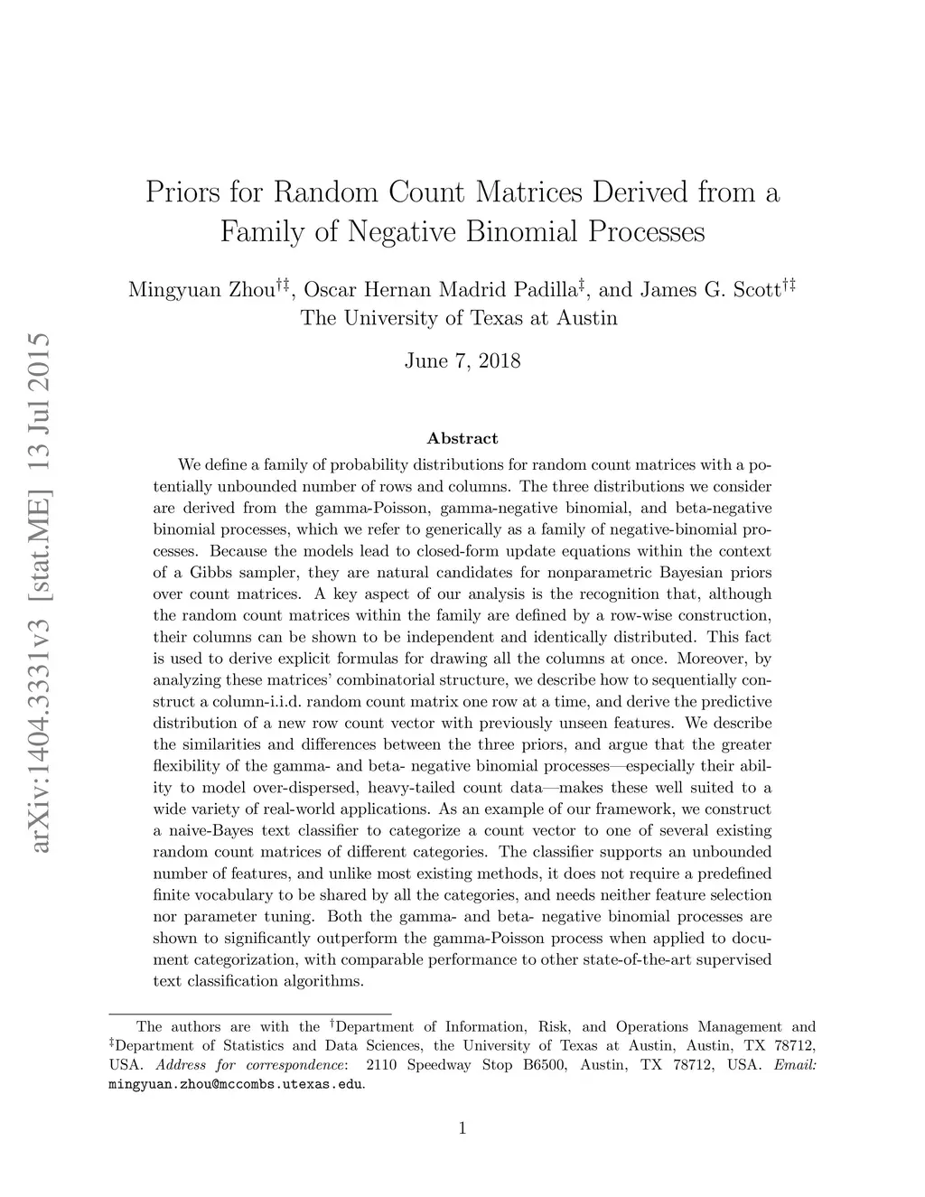 We define a family of probability distributions for random count matrices with a potentially unbounded number of rows and columns. The three distributions we consider are derived from the gamma-Poisson, gamma-negative binomial, and beta-negative binomial processes. Because the models lead to closed-form Gibbs sampling update equations, they are natural candidates for nonparametric Bayesian priors over count matrices. A key aspect of our analysis is the recognition that, although the random count matrices within the family are defined by a row-wise construction, their columns can be shown to be i.i.d. This fact is used to derive explicit formulas for drawing all the columns at once. Moreover, by analyzing these matrices' combinatorial structure, we describe how to sequentially construct a column-i.i.d. random count matrix one row at a time, and derive the predictive distribution of a new row count vector with previously unseen features. We describe the similarities and differences between the three priors, and argue that the greater flexibility of the gamma- and beta- negative binomial processes, especially their ability to model over-dispersed, heavy-tailed count data, makes these well suited to a wide variety of real-world applications. As an example of our framework, we construct a naive-Bayes text classifier to categorize a count vector to one of several existing random count matrices of different categories. The classifier supports an unbounded number of features, and unlike most existing methods, it does not require a predefined finite vocabulary to be shared by all the categories, and needs neither feature selection nor parameter tuning. Both the gamma- and beta- negative binomial processes are shown to significantly outperform the gamma-Poisson process for document categorization, with comparable performance to other state-of-the-art supervised text classification algorithms.