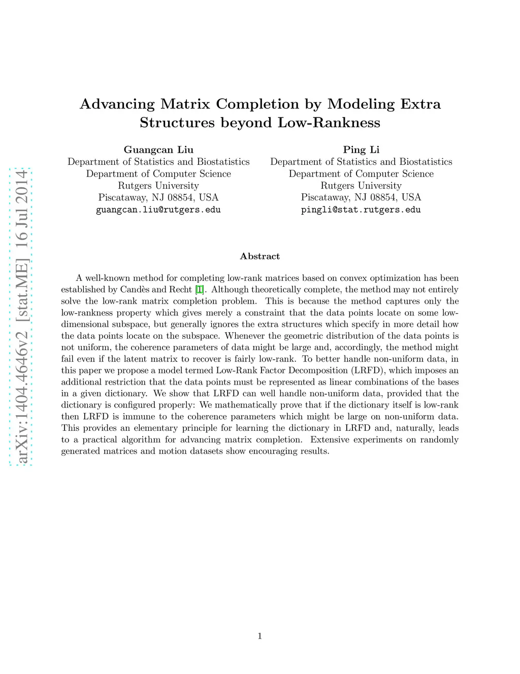 A well-known method for completing low-rank matrices based on convex optimization has been established by Cand{\`e}s and Recht. Although theoretically complete, the method may not entirely solve the low-rank matrix completion problem. This is because the method captures only the low-rankness property which gives merely a rough constraint that the data points locate on some low-dimensional subspace, but generally ignores the extra structures which specify in more detail how the data points locate on the subspace. Whenever the geometric distribution of the data points is not uniform, the coherence parameters of data might be large and, accordingly, the method might fail even if the latent matrix we want to recover is fairly low-rank. To better handle non-uniform data, in this paper we propose a method termed Low-Rank Factor Decomposition (LRFD), which imposes an additional restriction that the data points must be represented as linear combinations of the bases in a dictionary constructed or learnt in advance. We show that LRFD can well handle non-uniform data, provided that the dictionary is configured properly: We mathematically prove that if the dictionary itself is low-rank then LRFD is immune to the coherence parameters which might be large on non-uniform data. This provides an elementary principle for learning the dictionary in LRFD and, naturally, leads to a practical algorithm for advancing matrix completion. Extensive experiments on randomly generated matrices and motion datasets show encouraging results.