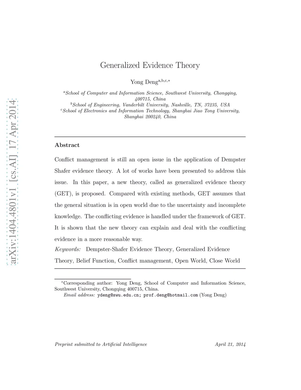 Conflict management is still an open issue in the application of Dempster Shafer evidence theory. A lot of works have been presented to address this issue. In this paper, a new theory, called as generalized evidence theory (GET), is proposed. Compared with existing methods, GET assumes that the general situation is in open world due to the uncertainty and incomplete knowledge. The conflicting evidence is handled under the framework of GET. It is shown that the new theory can explain and deal with the conflicting evidence in a more reasonable way.