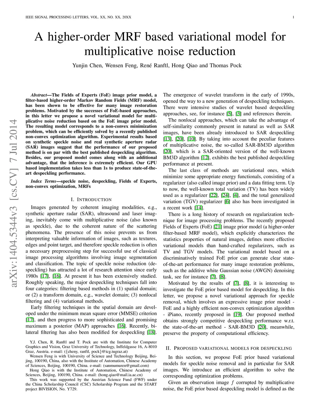 The Fields of Experts (FoE) image prior model, a filter-based higher-order Markov Random Fields (MRF) model, has been shown to be effective for many image restoration problems. Motivated by the successes of FoE-based approaches, in this letter, we propose a novel variational model for multiplicative noise reduction based on the FoE image prior model. The resulted model corresponds to a non-convex minimization problem, which can be solved by a recently published non-convex optimization algorithm. Experimental results based on synthetic speckle noise and real synthetic aperture radar (SAR) images suggest that the performance of our proposed method is on par with the best published despeckling algorithm. Besides, our proposed model comes along with an additional advantage, that the inference is extremely efficient. {Our GPU based implementation takes less than 1s to produce state-of-the-art despeckling performance.}