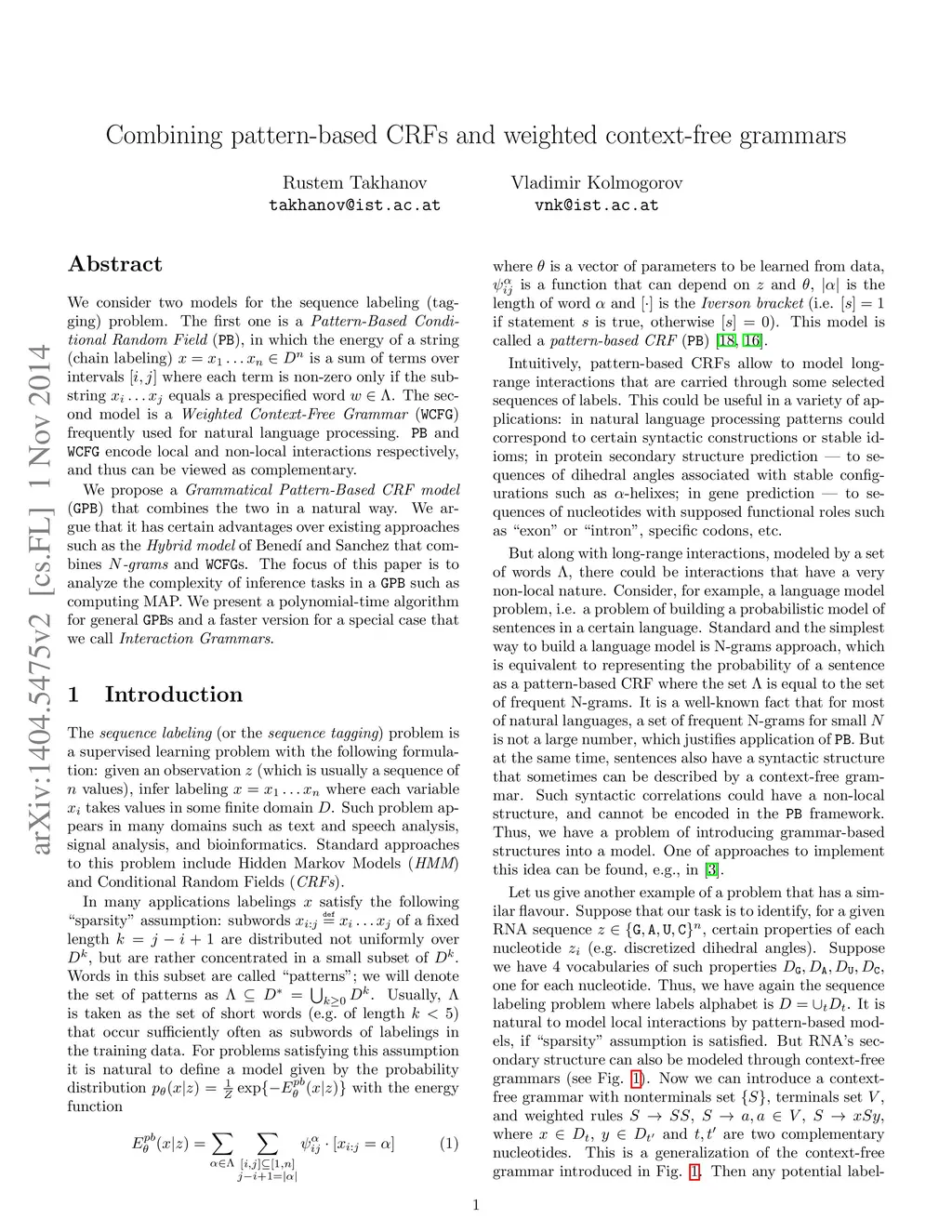 We consider two models for the sequence labeling (tagging) problem. The first one is a {\em Pattern-Based Conditional Random Field }(\PB), in which the energy of a string (chain labeling) is a sum of terms over intervals where each term is non-zero only if the substring equals a prespecified word . The second model is a {\em Weighted Context-Free Grammar }(\WCFG) frequently used for natural language processing. \PB and \WCFG encode local and non-local interactions respectively, and thus can be viewed as complementary. We propose a {\em Grammatical Pattern-Based CRF model }(\GPB) that combines the two in a natural way. We argue that it has certain advantages over existing approaches such as the {\em Hybrid model} of Bened{\í} and Sanchez that combines {\em \mbox{N-grams}} and \WCFGs. The focus of this paper is to analyze the complexity of inference tasks in a \GPB such as computing MAP. We present a polynomial-time algorithm for general \GPBs and a faster version for a special case that we call {\em Interaction Grammars}.