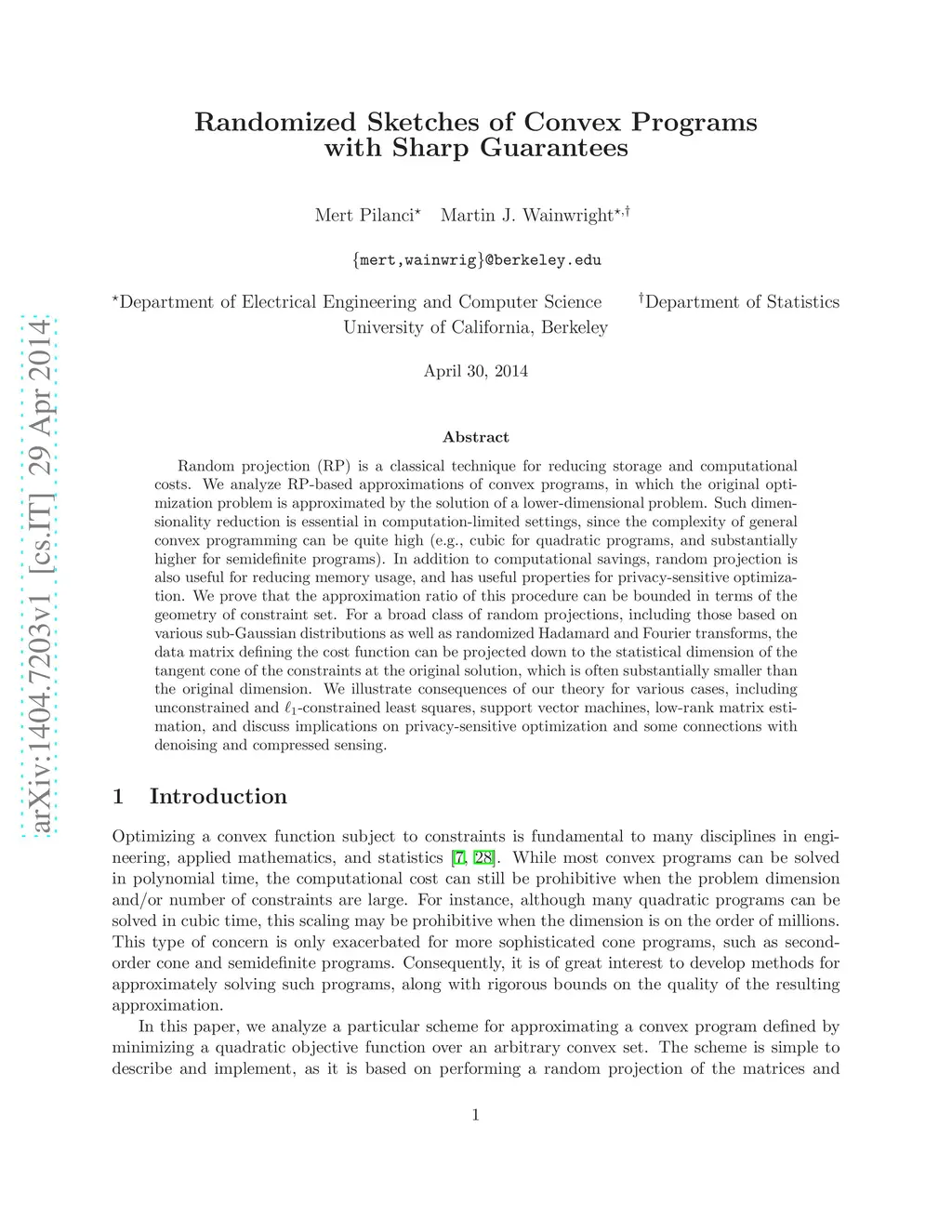 Random projection (RP) is a classical technique for reducing storage and computational costs. We analyze RP-based approximations of convex programs, in which the original optimization problem is approximated by the solution of a lower-dimensional problem. Such dimensionality reduction is essential in computation-limited settings, since the complexity of general convex programming can be quite high (e.g., cubic for quadratic programs, and substantially higher for semidefinite programs). In addition to computational savings, random projection is also useful for reducing memory usage, and has useful properties for privacy-sensitive optimization. We prove that the approximation ratio of this procedure can be bounded in terms of the geometry of constraint set. For a broad class of random projections, including those based on various sub-Gaussian distributions as well as randomized Hadamard and Fourier transforms, the data matrix defining the cost function can be projected down to the statistical dimension of the tangent cone of the constraints at the original solution, which is often substantially smaller than the original dimension. We illustrate consequences of our theory for various cases, including unconstrained and -constrained least squares, support vector machines, low-rank matrix estimation, and discuss implications on privacy-sensitive optimization and some connections with de-noising and compressed sensing.