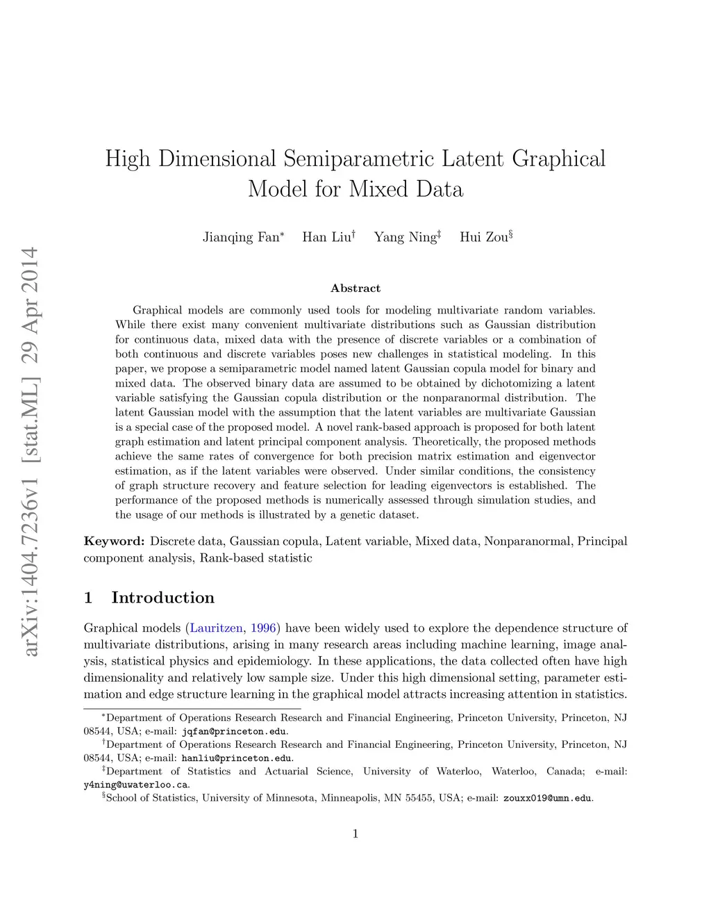 Graphical models are commonly used tools for modeling multivariate random variables. While there exist many convenient multivariate distributions such as Gaussian distribution for continuous data, mixed data with the presence of discrete variables or a combination of both continuous and discrete variables poses new challenges in statistical modeling. In this paper, we propose a semiparametric model named latent Gaussian copula model for binary and mixed data. The observed binary data are assumed to be obtained by dichotomizing a latent variable satisfying the Gaussian copula distribution or the nonparanormal distribution. The latent Gaussian model with the assumption that the latent variables are multivariate Gaussian is a special case of the proposed model. A novel rank-based approach is proposed for both latent graph estimation and latent principal component analysis. Theoretically, the proposed methods achieve the same rates of convergence for both precision matrix estimation and eigenvector estimation, as if the latent variables were observed. Under similar conditions, the consistency of graph structure recovery and feature selection for leading eigenvectors is established. The performance of the proposed methods is numerically assessed through simulation studies, and the usage of our methods is illustrated by a genetic dataset.