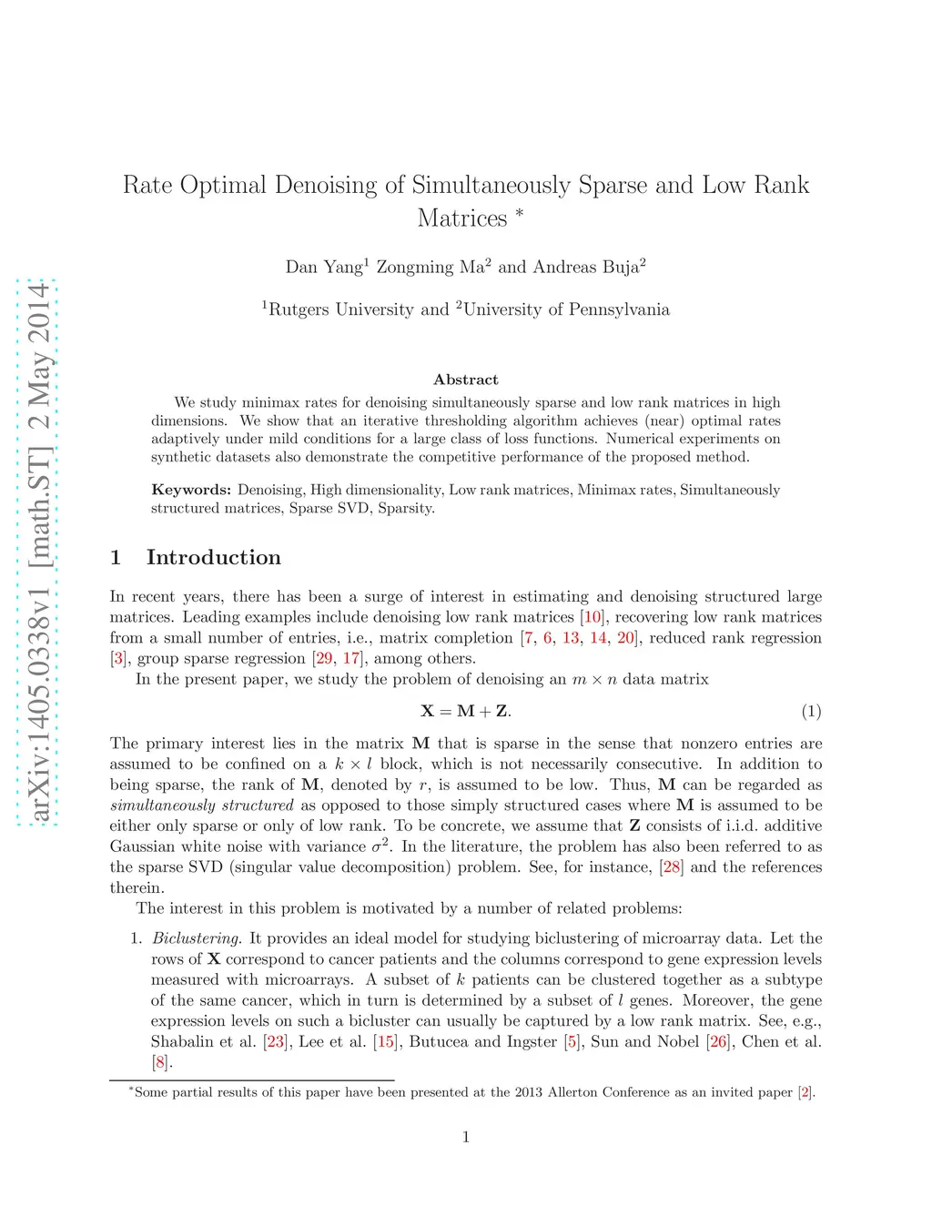 We study minimax rates for denoising simultaneously sparse and low rank matrices in high dimensions. We show that an iterative thresholding algorithm achieves (near) optimal rates adaptively under mild conditions for a large class of loss functions. Numerical experiments on synthetic datasets also demonstrate the competitive performance of the proposed method.