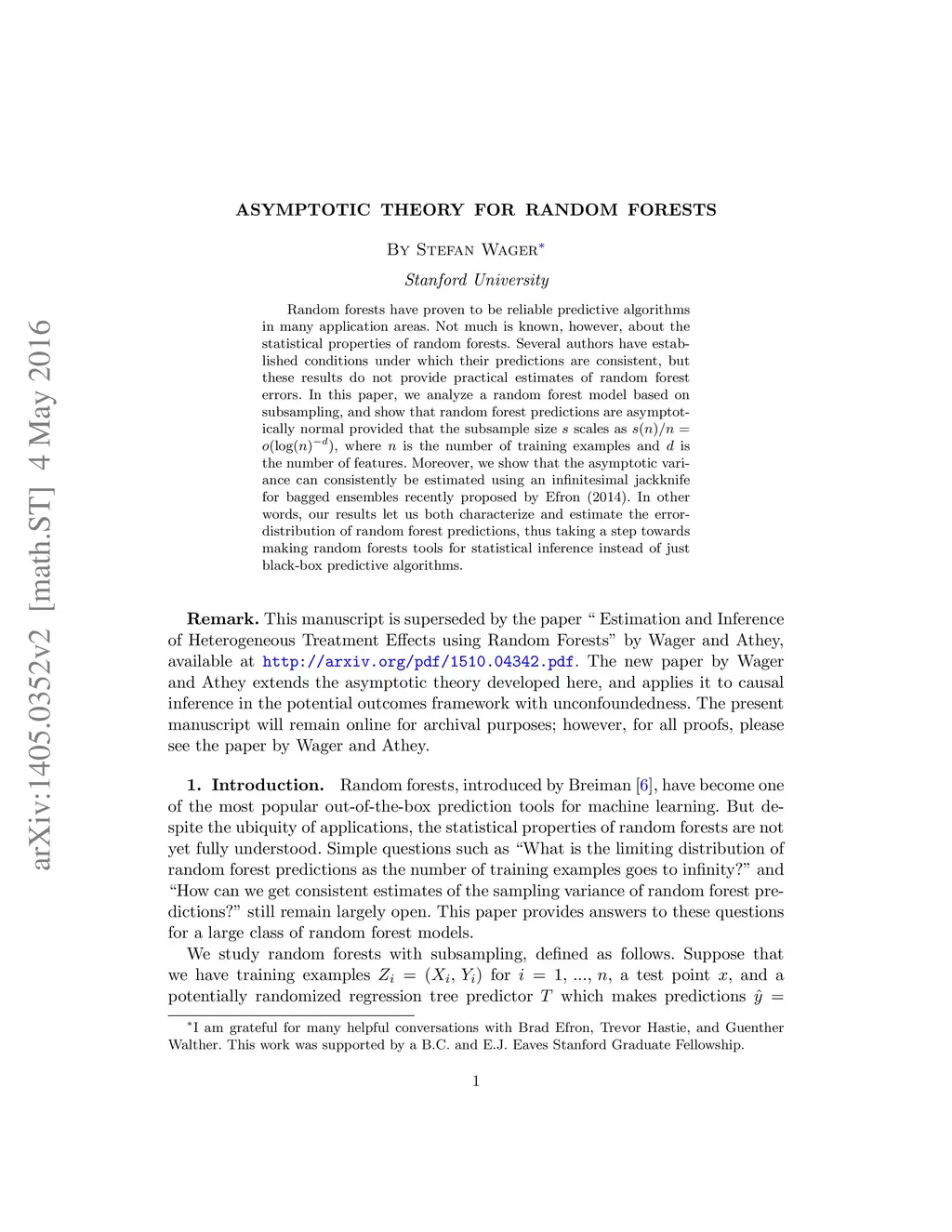 Random forests have proven to be reliable predictive algorithms in many application areas. Not much is known, however, about the statistical properties of random forests. Several authors have established conditions under which their predictions are consistent, but these results do not provide practical estimates of random forest errors. In this paper, we analyze a random forest model based on subsampling, and show that random forest predictions are asymptotically normal provided that the subsample size s scales as s(n)/n = o(log(n)^{-d}), where n is the number of training examples and d is the number of features. Moreover, we show that the asymptotic variance can consistently be estimated using an infinitesimal jackknife for bagged ensembles recently proposed by Efron (2014). In other words, our results let us both characterize and estimate the error-distribution of random forest predictions, thus taking a step towards making random forests tools for statistical inference instead of just black-box predictive algorithms.