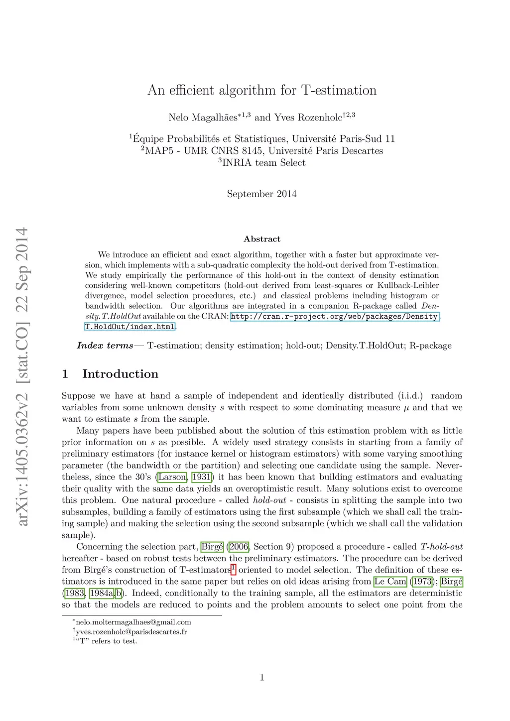 We introduce an efficient and exact algorithm, together with a faster but approximate version, which implements with a sub-quadratic complexity the hold-out derived from T-estimation. We study empirically the performance of this hold-out in the context of density estimation considering well-known competitors (hold-out derived from least-squares or Kullback-Leibler divergence, model selection procedures, etc.) and classical problems including histogram or bandwidth selection. Our algorithms are integrated in a companion R-package called Density.T.HoldOut available on the CRAN