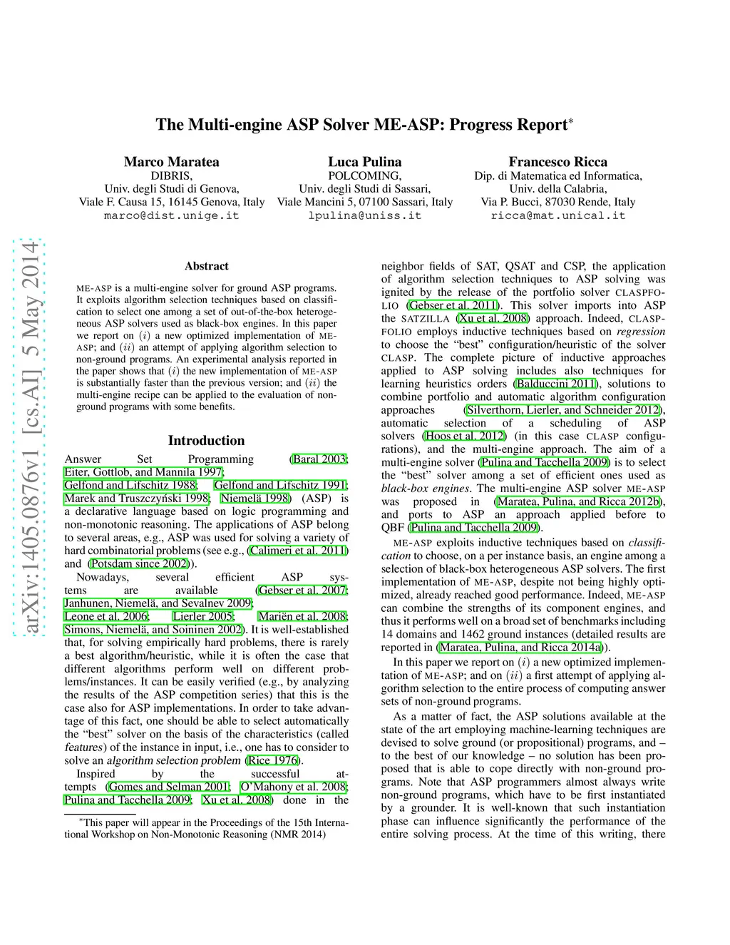 The Multi-engine ASP Solver ME-ASP: Progress Report
