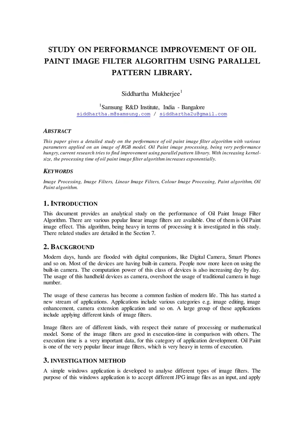 This paper gives a detailed study on the performance of oil paint image filter algorithm with various parameters applied on an image of RGB model. Oil Paint image processing, being very performance hungry, current research tries to find improvement using parallel pattern library. With increasing kernel-size, the processing time of oil paint image filter algorithm increases exponentially.