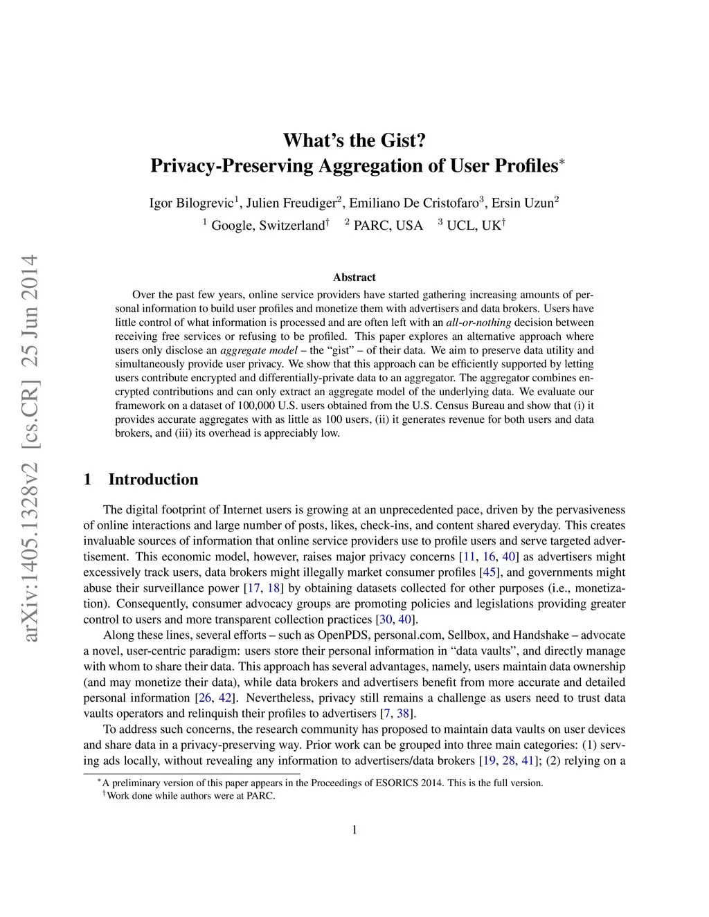Over the past few years, online service providers have started gathering increasing amounts of personal information to build user profiles and monetize them with advertisers and data brokers. Users have little control of what information is processed and are often left with an all-or-nothing decision between receiving free services or refusing to be profiled. This paper explores an alternative approach where users only disclose an aggregate model -- the "gist" -- of their data. We aim to preserve data utility and simultaneously provide user privacy. We show that this approach can be efficiently supported by letting users contribute encrypted and differentially-private data to an aggregator. The aggregator combines encrypted contributions and can only extract an aggregate model of the underlying data. We evaluate our framework on a dataset of 100,000 U.S. users obtained from the U.S. Census Bureau and show that (i) it provides accurate aggregates with as little as 100 users, (ii) it generates revenue for both users and data brokers, and (iii) its overhead is appreciably low.