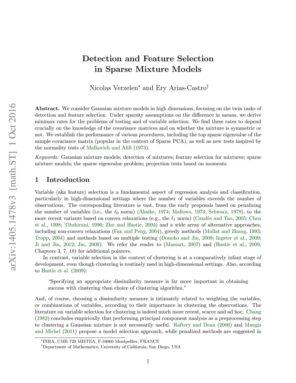 We consider Gaussian mixture models in high dimensions and concentrate on the twin tasks of detection and feature selection. Under sparsity assumptions on the difference in means, we derive information bounds and establish the performance of various procedures, including the top sparse eigenvalue of the sample covariance matrix and other projection tests based on moments, such as the skewness and kurtosis tests of Malkovich and Afifi (1973), and other variants which we were better able to control under the null.