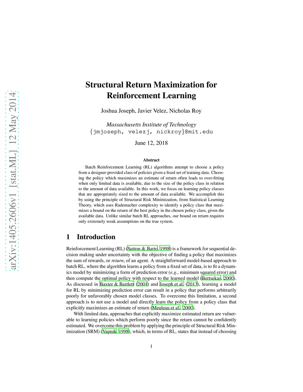 Batch Reinforcement Learning (RL) algorithms attempt to choose a policy from a designer-provided class of policies given a fixed set of training data. Choosing the policy which maximizes an estimate of return often leads to over-fitting when only limited data is available, due to the size of the policy class in relation to the amount of data available. In this work, we focus on learning policy classes that are appropriately sized to the amount of data available. We accomplish this by using the principle of Structural Risk Minimization, from Statistical Learning Theory, which uses Rademacher complexity to identify a policy class that maximizes a bound on the return of the best policy in the chosen policy class, given the available data. Unlike similar batch RL approaches, our bound on return requires only extremely weak assumptions on the true system.