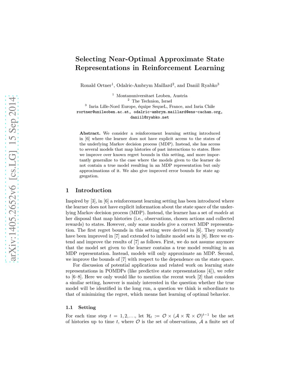 We consider a reinforcement learning setting introduced in (Maillard et al., NIPS 2011) where the learner does not have explicit access to the states of the underlying Markov decision process (MDP). Instead, she has access to several models that map histories of past interactions to states. Here we improve over known regret bounds in this setting, and more importantly generalize to the case where the models given to the learner do not contain a true model resulting in an MDP representation but only approximations of it. We also give improved error bounds for state aggregation.