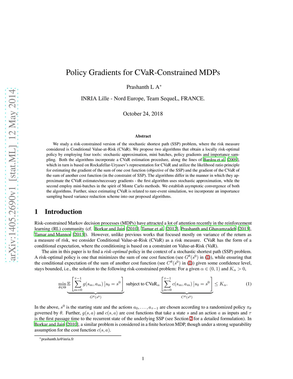 We study a risk-constrained version of the stochastic shortest path (SSP) problem, where the risk measure considered is Conditional Value-at-Risk (CVaR). We propose two algorithms that obtain a locally risk-optimal policy by employing four tools: stochastic approximation, mini batches, policy gradients and importance sampling. Both the algorithms incorporate a CVaR estimation procedure, along the lines of Bardou et al. [2009], which in turn is based on Rockafellar-Uryasev's representation for CVaR and utilize the likelihood ratio principle for estimating the gradient of the sum of one cost function (objective of the SSP) and the gradient of the CVaR of the sum of another cost function (in the constraint of SSP). The algorithms differ in the manner in which they approximate the CVaR estimates/necessary gradients - the first algorithm uses stochastic approximation, while the second employ mini-batches in the spirit of Monte Carlo methods. We establish asymptotic convergence of both the algorithms. Further, since estimating CVaR is related to rare-event simulation, we incorporate an importance sampling based variance reduction scheme into our proposed algorithms.
