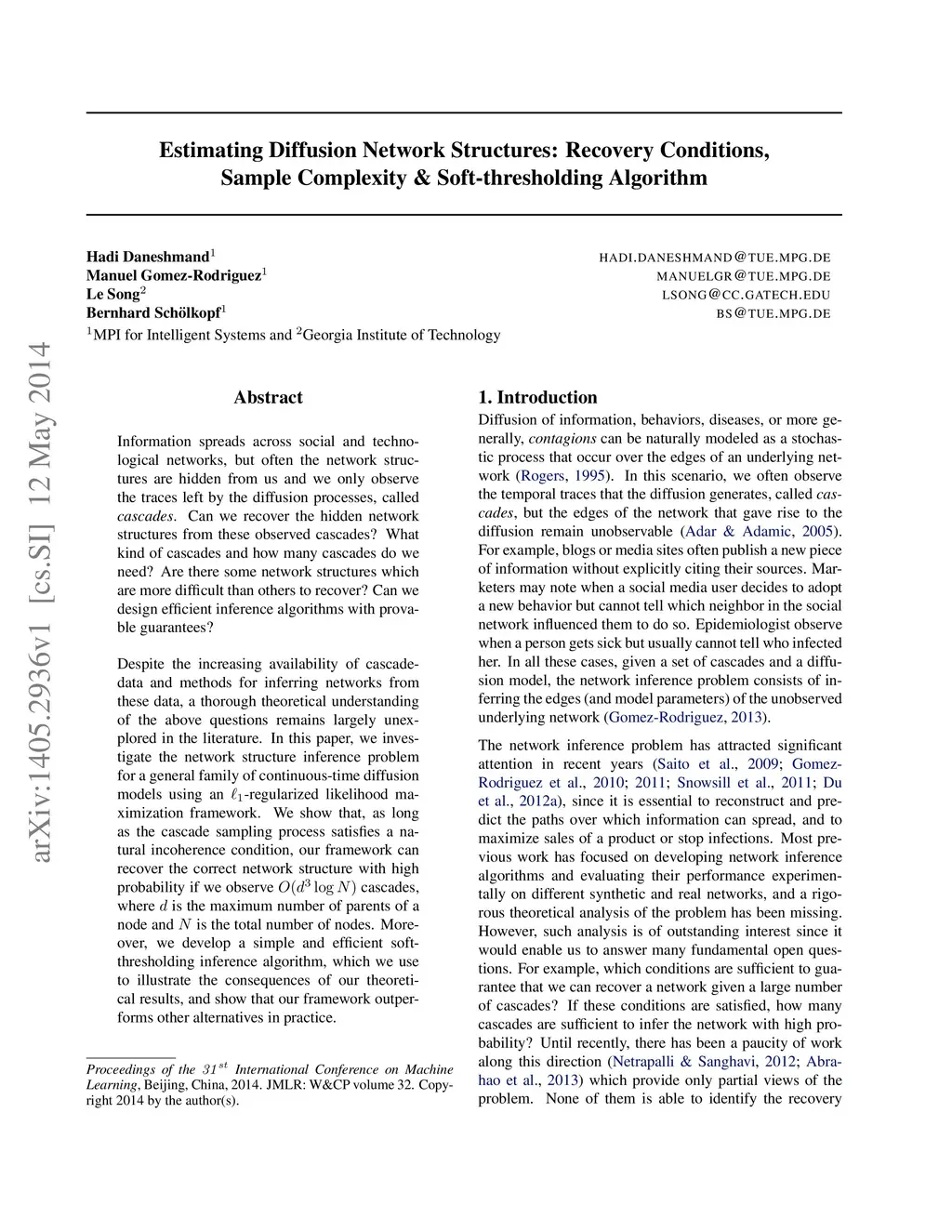 Information spreads across social and technological networks, but often the network structures are hidden from us and we only observe the traces left by the diffusion processes, called cascades. Can we recover the hidden network structures from these observed cascades? What kind of cascades and how many cascades do we need? Are there some network structures which are more difficult than others to recover? Can we design efficient inference algorithms with provable guarantees? Despite the increasing availability of cascade data and methods for inferring networks from these data, a thorough theoretical understanding of the above questions remains largely unexplored in the literature. In this paper, we investigate the network structure inference problem for a general family of continuous-time diffusion models using an -regularized likelihood maximization framework. We show that, as long as the cascade sampling process satisfies a natural incoherence condition, our framework can recover the correct network structure with high probability if we observe cascades, where is the maximum number of parents of a node and is the total number of nodes. Moreover, we develop a simple and efficient soft-thresholding inference algorithm, which we use to illustrate the consequences of our theoretical results, and show that our framework outperforms other alternatives in practice.