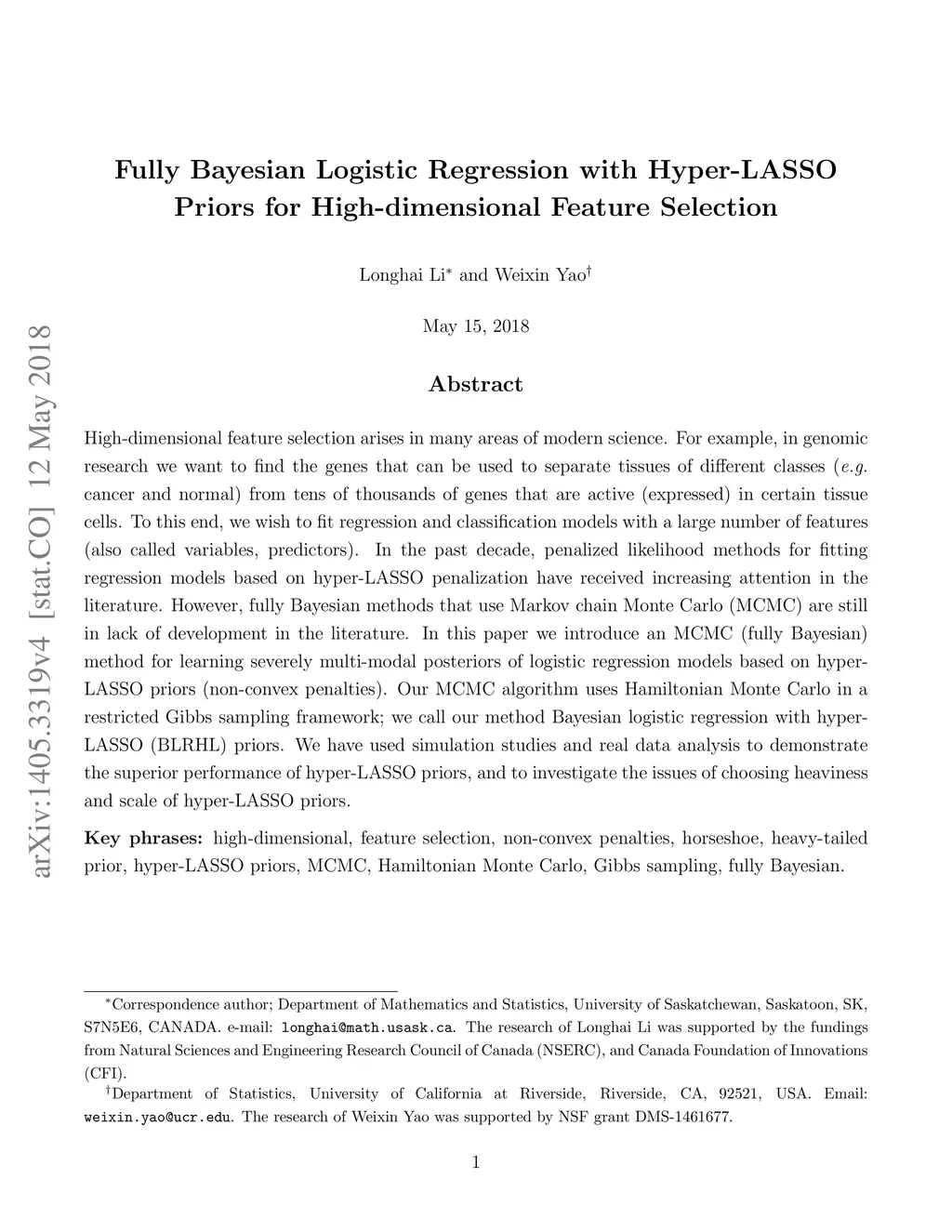 High-dimensional feature selection arises in many areas of modern science. For example, in genomic research we want to find the genes that can be used to separate tissues of different classes (e.g. cancer and normal) from tens of thousands of genes that are active (expressed) in certain tissue cells. To this end, we wish to fit regression and classification models with a large number of features (also called variables, predictors). In the past decade, penalized likelihood methods for fitting regression models based on hyper-LASSO penalization have received increasing attention in the literature. However, fully Bayesian methods that use Markov chain Monte Carlo (MCMC) are still in lack of development in the literature. In this paper we introduce an MCMC (fully Bayesian) method for learning severely multi-modal posteriors of logistic regression models based on hyper-LASSO priors (non-convex penalties). Our MCMC algorithm uses Hamiltonian Monte Carlo in a restricted Gibbs sampling framework; we call our method Bayesian logistic regression with hyper-LASSO (BLRHL) priors. We have used simulation studies and real data analysis to demonstrate the superior performance of hyper-LASSO priors, and to investigate the issues of choosing heaviness and scale of hyper-LASSO priors.